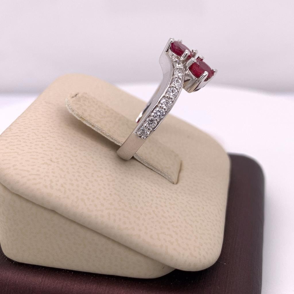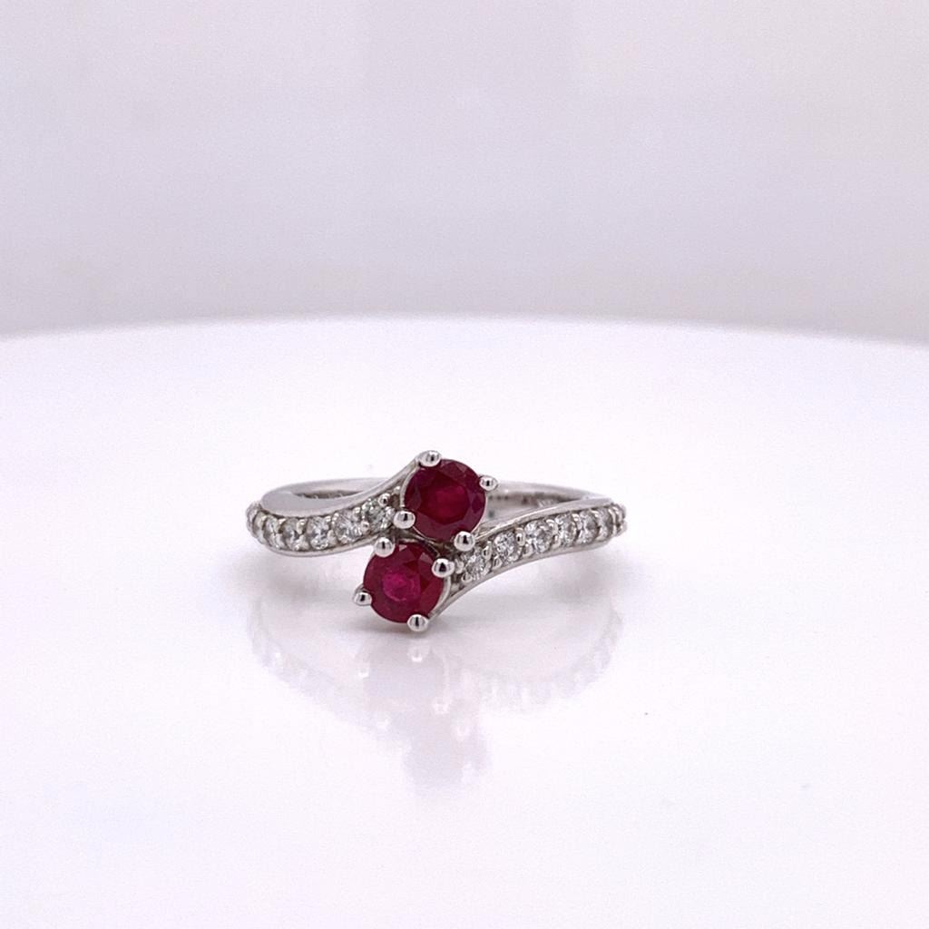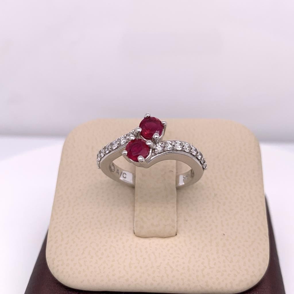 14Kt White Gold Ring. With 2 Full Cut Round Rubies Color - Red, Clarity Si. Each Set In A 4 Prong Setting In Criss Cross Design & Full Cut Round Brilliant Cut Diamonds Half Way On Each Side Of The Ring. Color -H-I, Clarity Si1-Si2. Weight 5.7 Grams.  , 14K White Gold  , Natural Rubies & Diamonds , 2 Round Rubies 0.88Ct Round Diams 0.40Ct , Size 6 1/2 , Free Sizing Upto 2 Sizes Up Or Down , New From Manufacture.