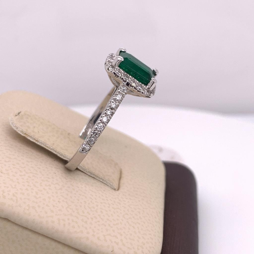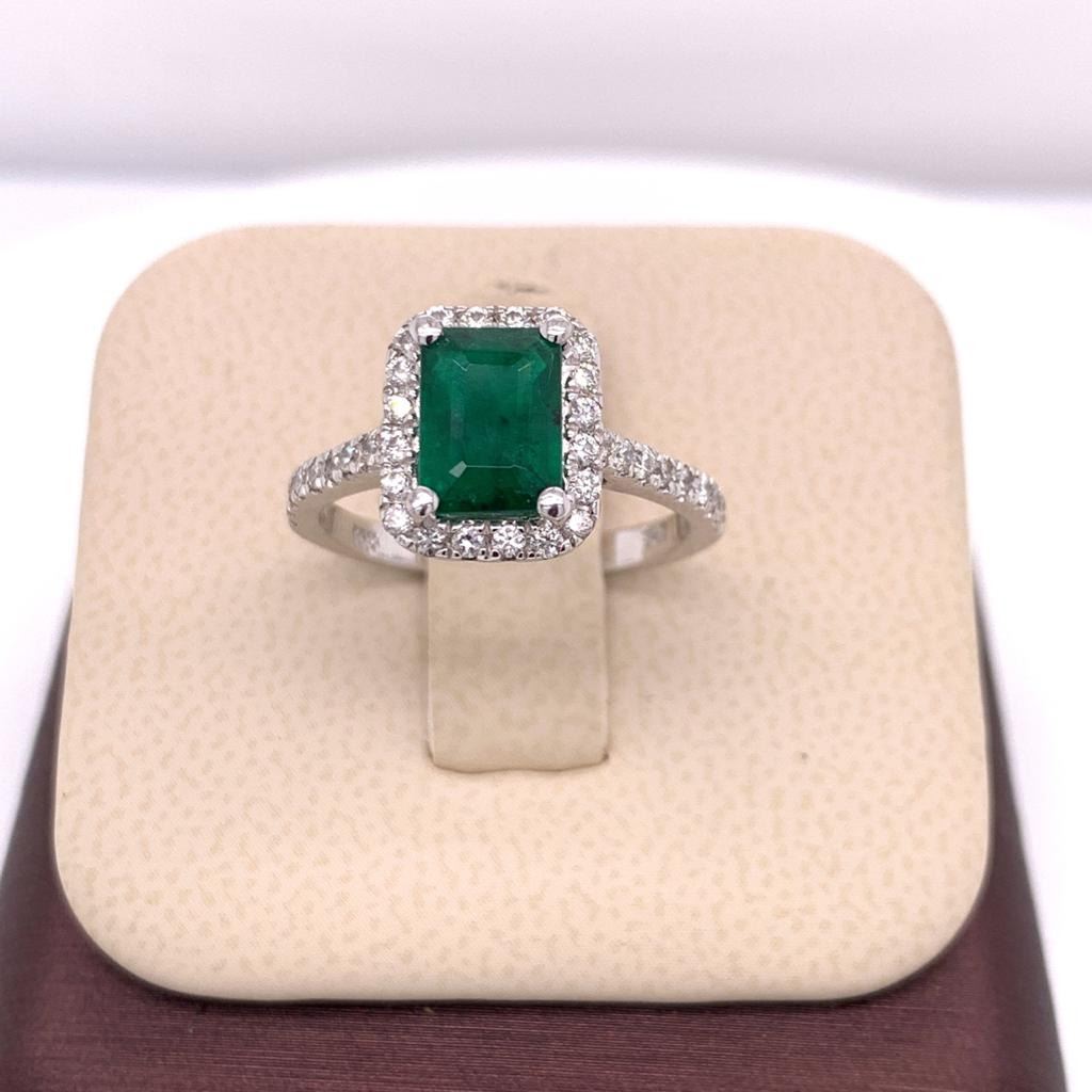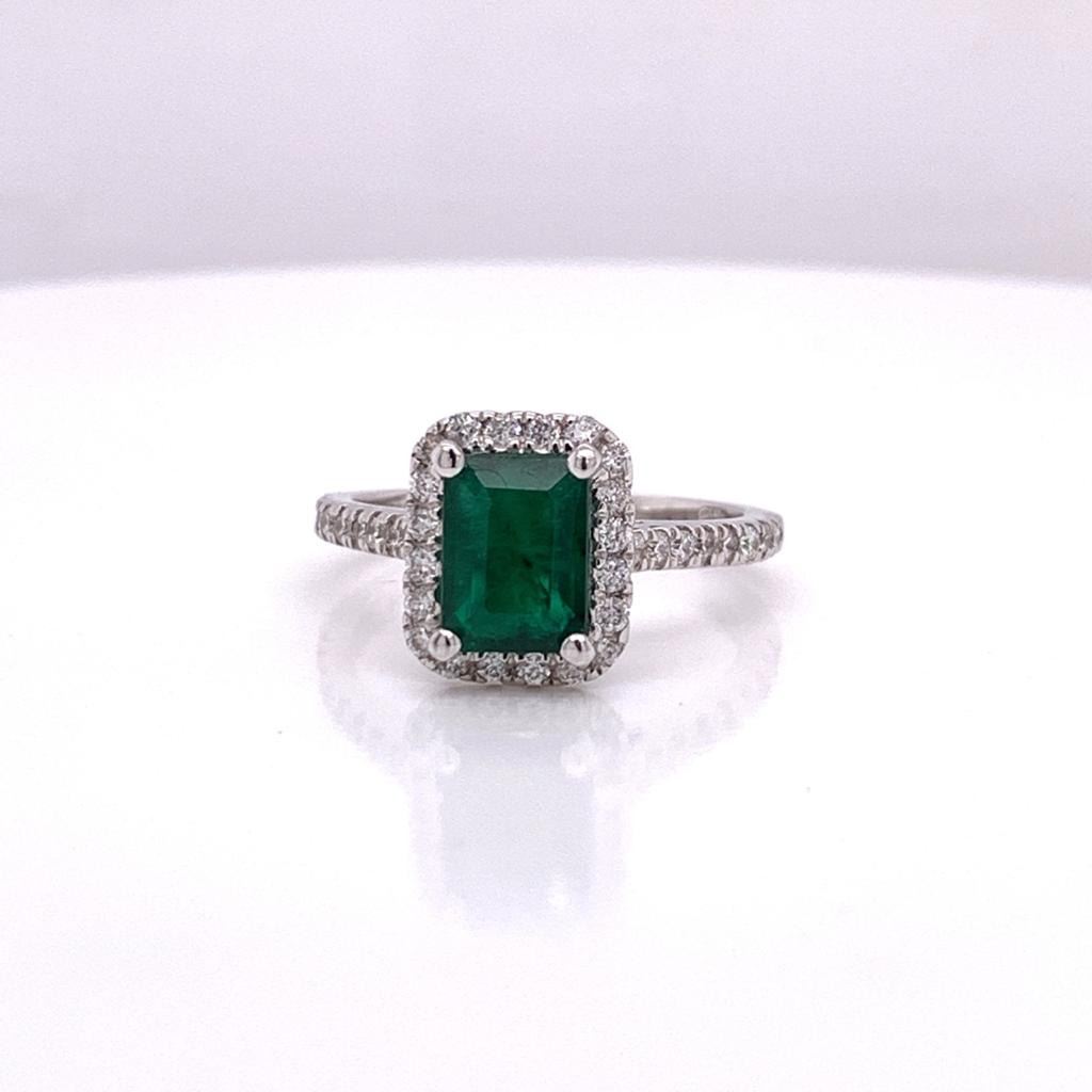 14Kt White Gold Ring. With A Single Emerald Cut Emerald Set In The Center. Color - Green, Clarity - SI3 In 4 Prong "Halo" Setting With Full Cut Round Brilliant Cut Diamonds Prong Set Around It & Half Way On The Band. Color - H-I, Clarity - SI1-SI2. Weight 3.7 Grams. , 14K White Gold , Natural Emerald & Diamond , Center Emerald 1.55Ct Rds 0.45Ct , Size7 , Free Sizing Upto 2 Sizes Up Or Down , New From Manufacture.