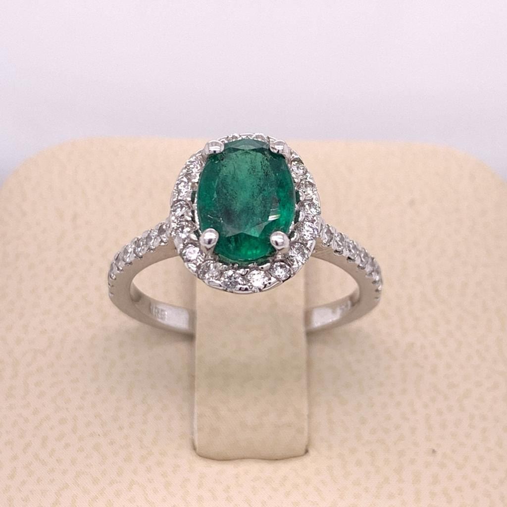 14Kt White Gold Ring. With A Single Full Cut Oval Emerald Set In The Center In A 4 Prong Setting. Color - Green, Clarity - SI3 & Full Cut Round Brilliant Cut Diamonds Set Around It In A "HALO" Designed Ring & Half Way On The Band. Color - H-I, Clarity - SI1- SI2, Weight 3.4 Grams. , 14K White Gold , Natural Emerald & Diamond , Center Oval Emerald 1.51Ct Rds 0.55Ct , Size 6 , Free Sizing Upto 2 Sizes Up Or Down , New From Manufacture.