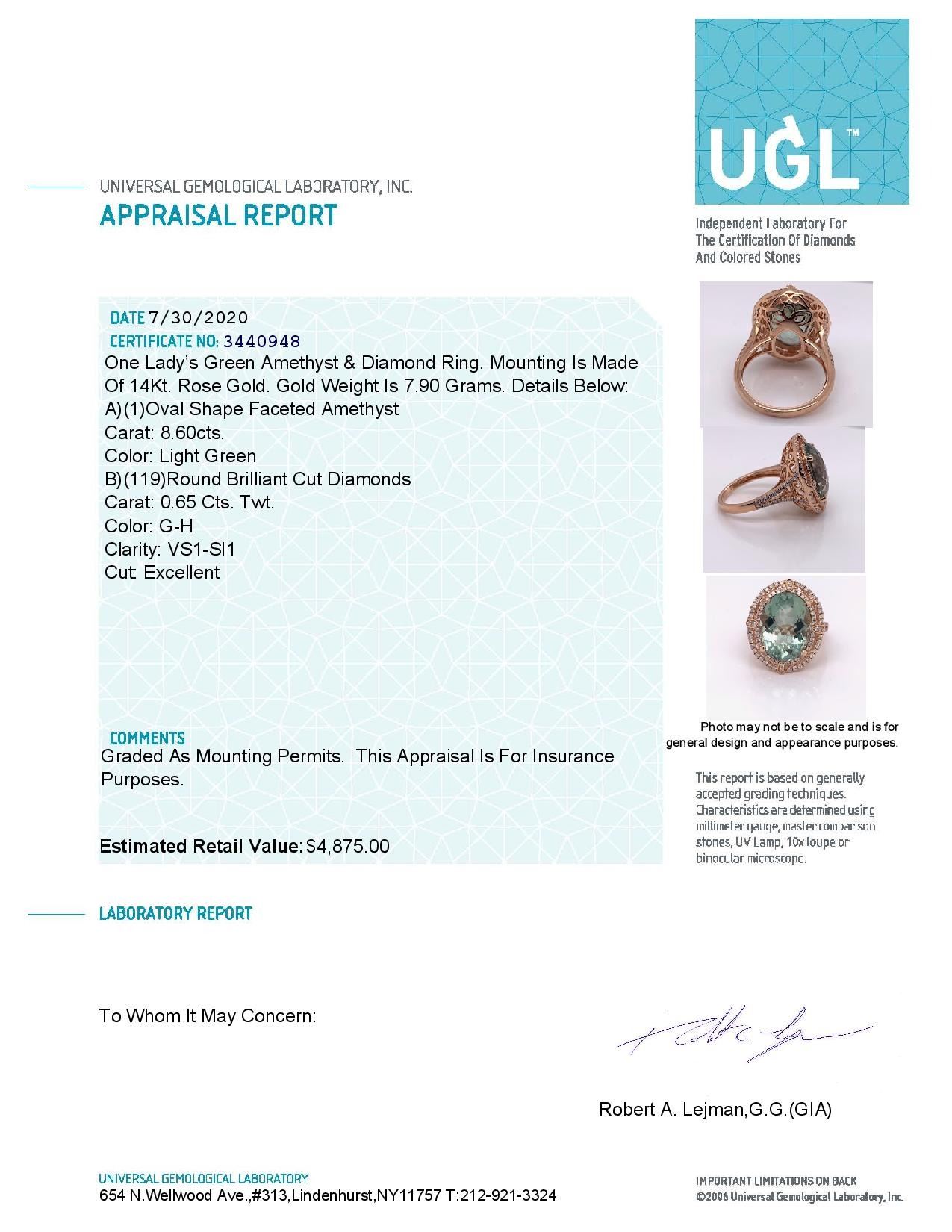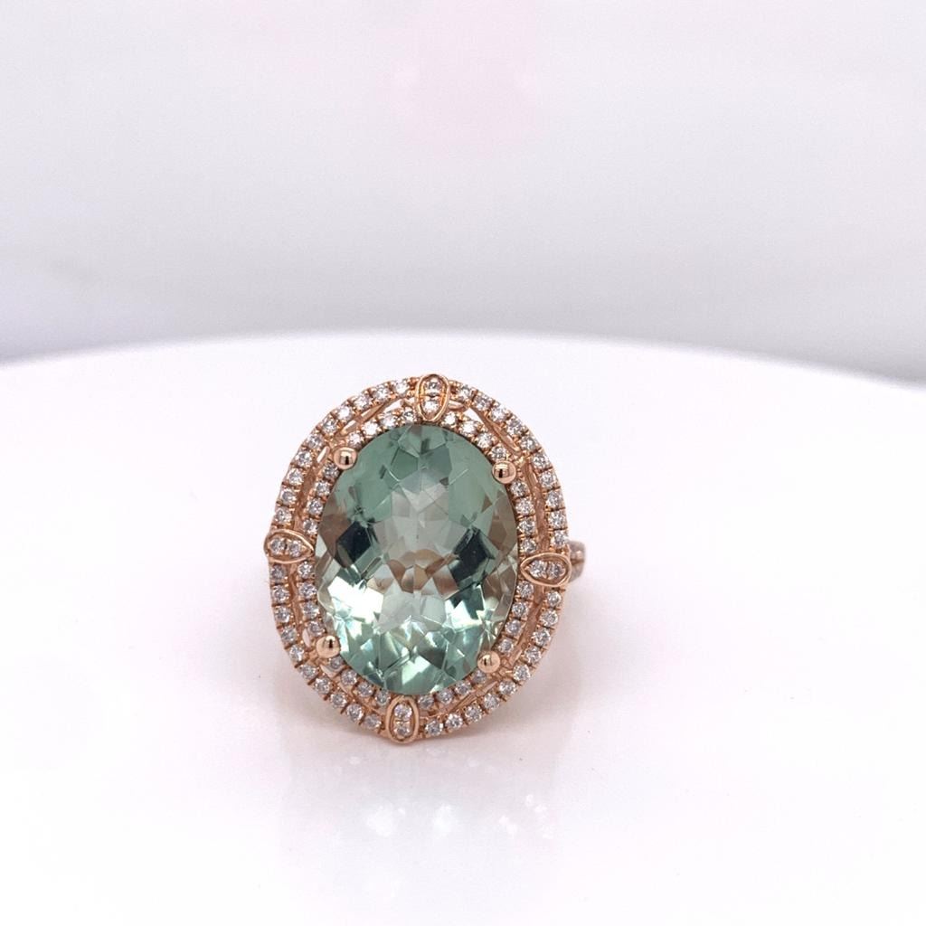 14Kt Rose Gold Ring With 8.57Ct Oval Multi Faceted Green Amethyst Set In The Center In A 4 Prong Setting & 0.65Cts Of Full Cut Round Brilliant Cut Diamonds Prong Set In A Double "Halo" And With Diamonds Half Way In Either Side.