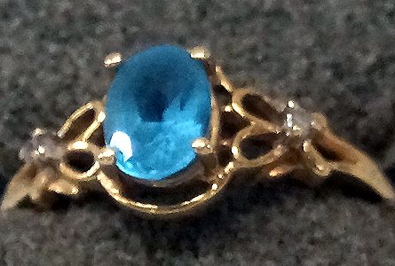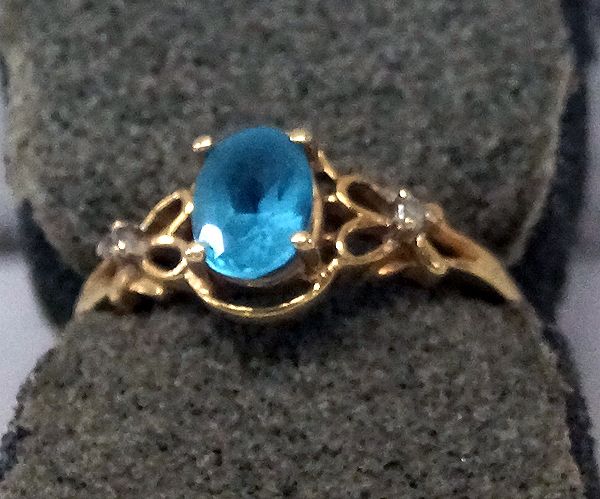 14Kt Gold, Blue Topaz, and Diamond Ring, Size 7, filigree hearts on sides of topaz, measures 3/8''W, 3.1g in total wt.