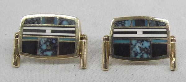 14Kt Gold Channel Inlay Kachina Faces Earrings. Pierced earrings with Turquoise, Lapis, Ivory, all channel inlay. Measure approx. 1/2''H x 3/4''W. Buyers Pay Actual Shipping and Handling Charges(see terms and conditions for more information).