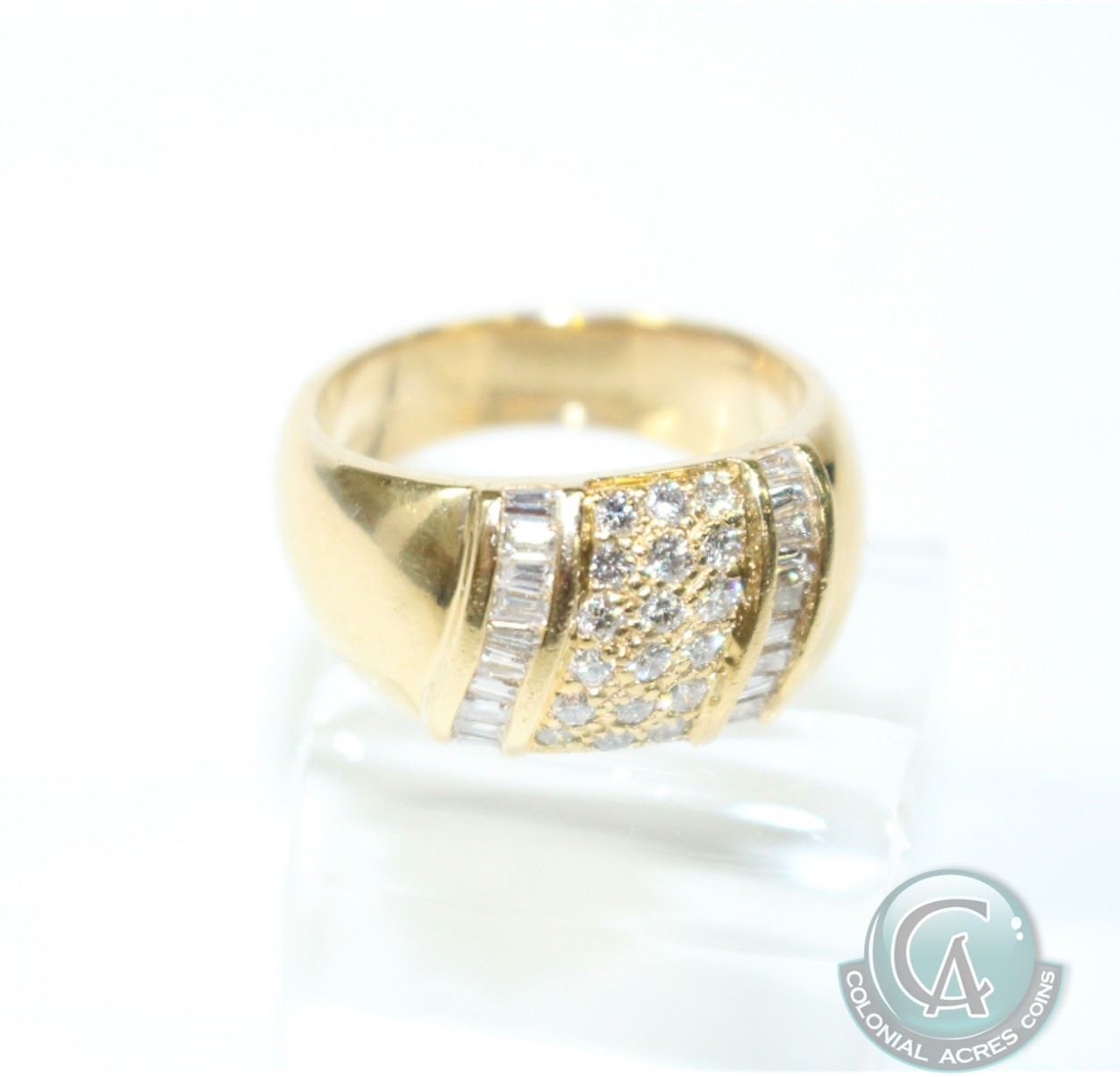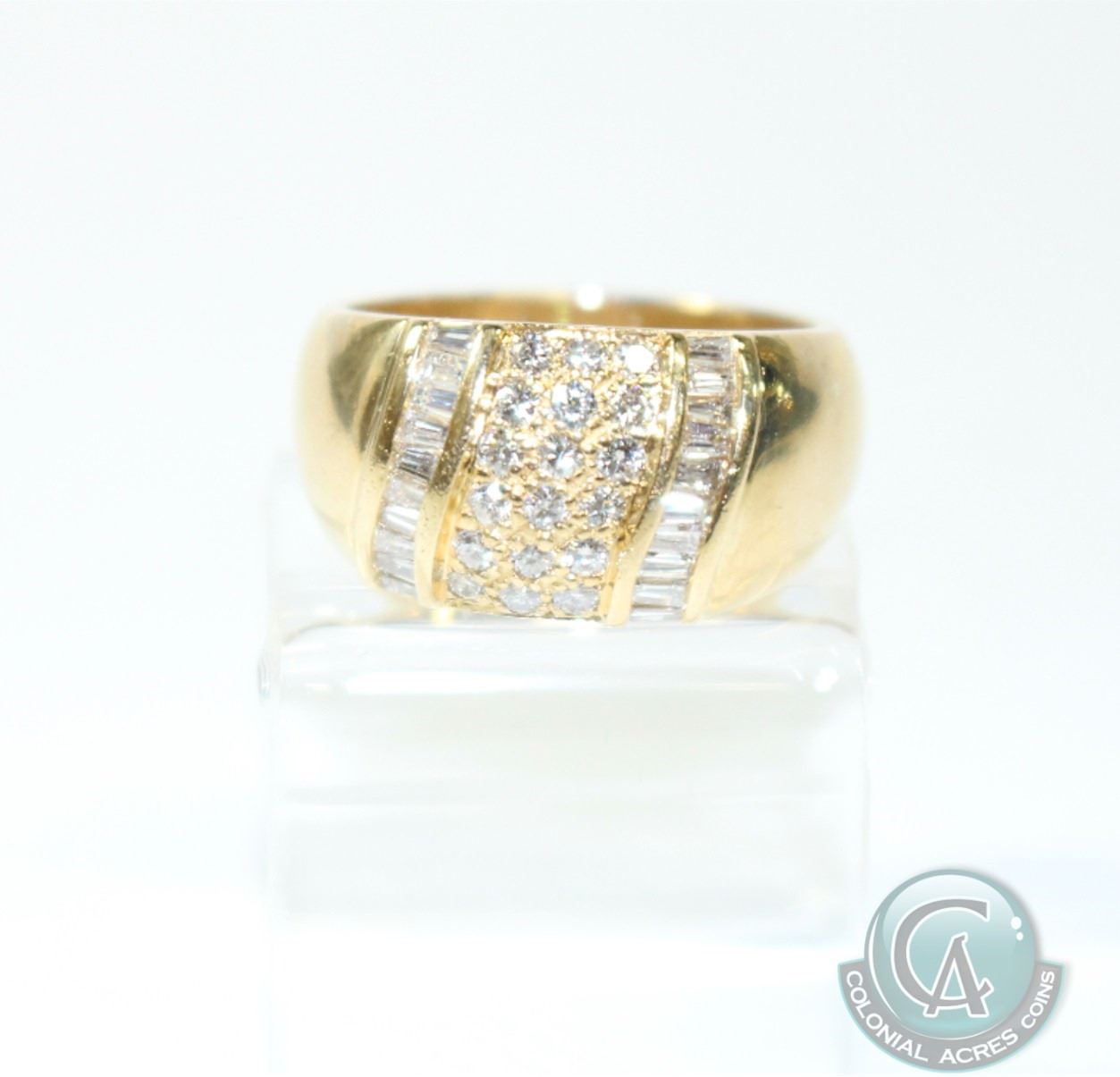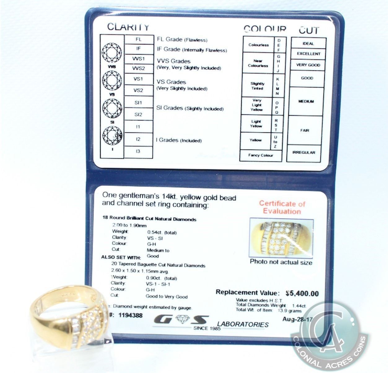 14Kt Gold Channel Set Men's Ring with 38 diamonds - Ring Size 11. Item comes with an appraisal by GS Labratories. Replacement Value is $5400.00. One Gentlemen's 14Kt yellow gold bead and channel set ring containing: 18 Round Brilliant Cut Natural Diamonds; 2.00 to 1.90mm. Weight: 0.54ct (total). Clarity: VS-SI - Colour: G-H -Cut: Medium to Good. Also Set with 20 Tapered Baguette Cut Natural Diamonds; 2.60 x 1.50 x 1.15 avg. Weight: 0.90ct (total) . Clarity: VS-1 - SI-1 - Colour: G-H - Cut: Good to Very Good. Total weight of the item is 13.9 grams. Total diamond weight: 1.44 Ct.