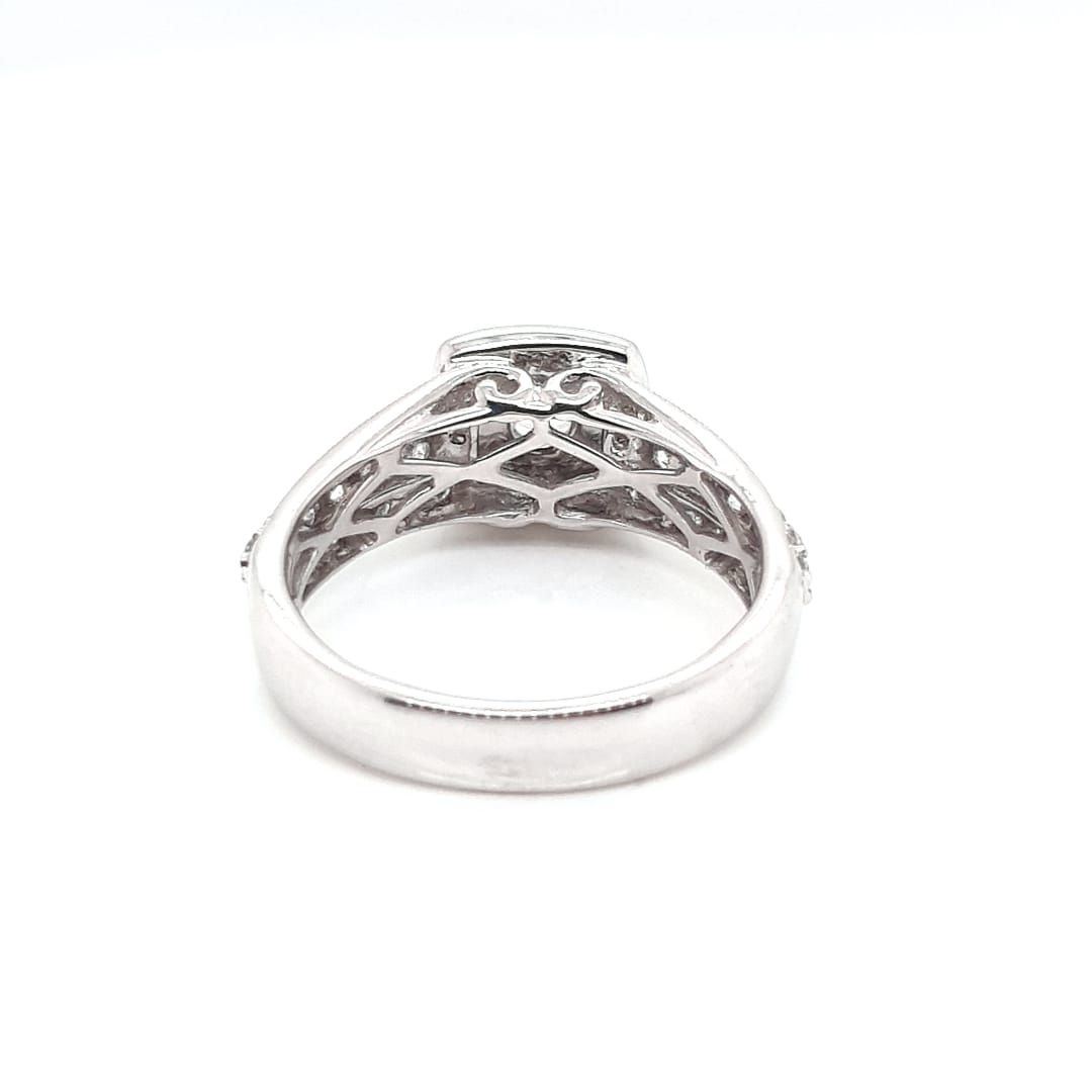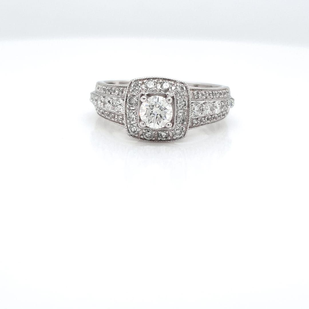 14Kt White Gold Ring. With 1 Full Cut Round Brilliant Cut Diamond Color H, Clarity SI2 Set In The Center In A 4 Prong Setting & Full Cut Round Brilliant Cut Diamonds Set Around It In A Cushion Halo Setting And 3 Rows 1/2 Way On Either Side Of The Band. Complete Ring Has A Milgrain Finish.
