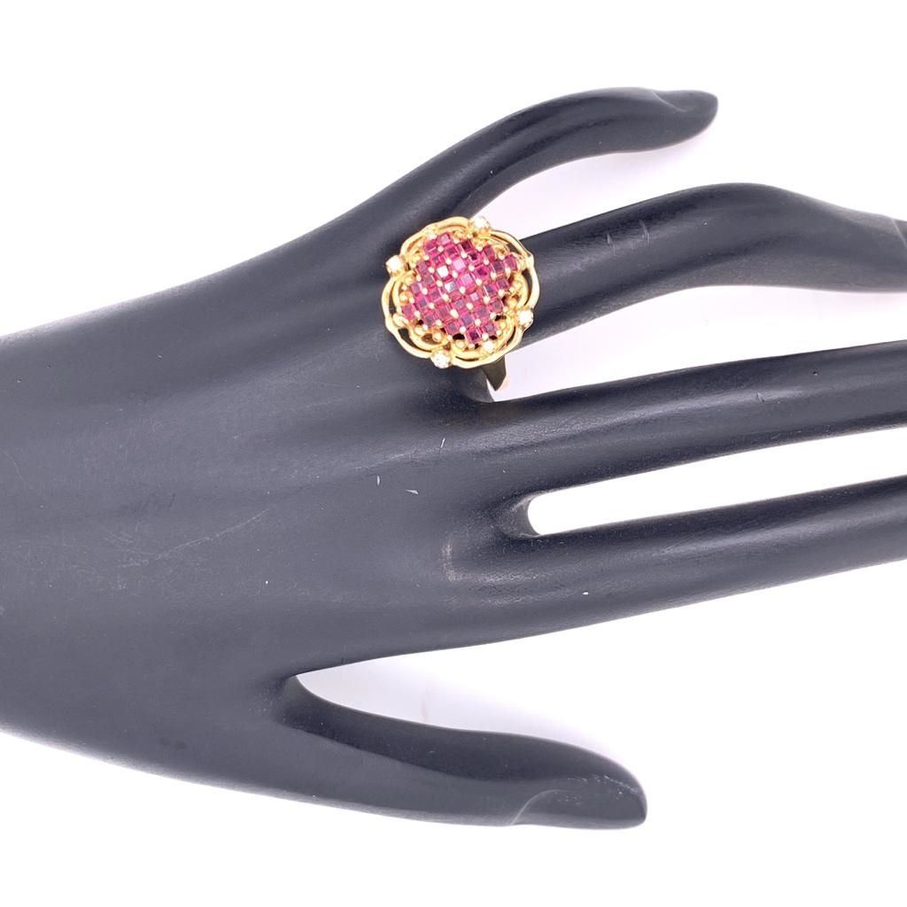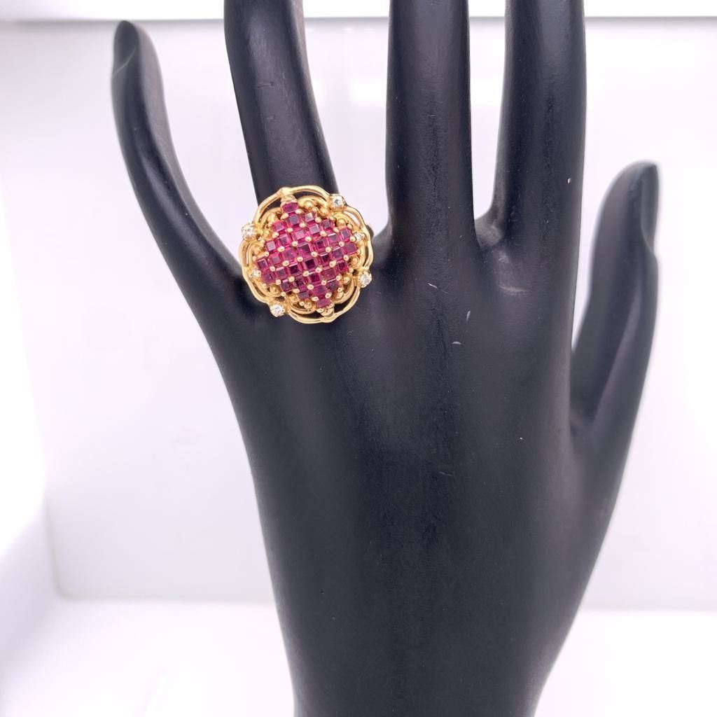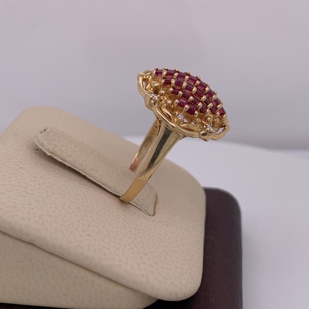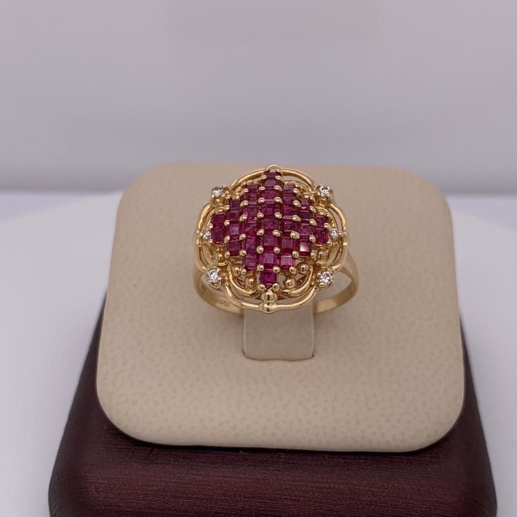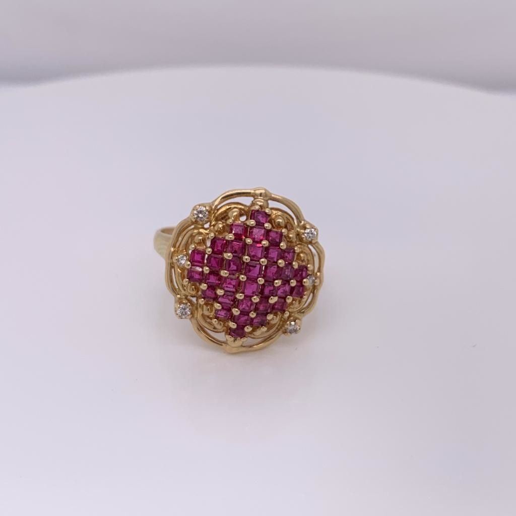 14Kt Yellow Gold Ring. With full Cut Princess Cut Rubies Clarity VS2 Set In The Center In A Prong Setting & Full Cut Round Brilliant Cut Diamonds Set On The Sides.