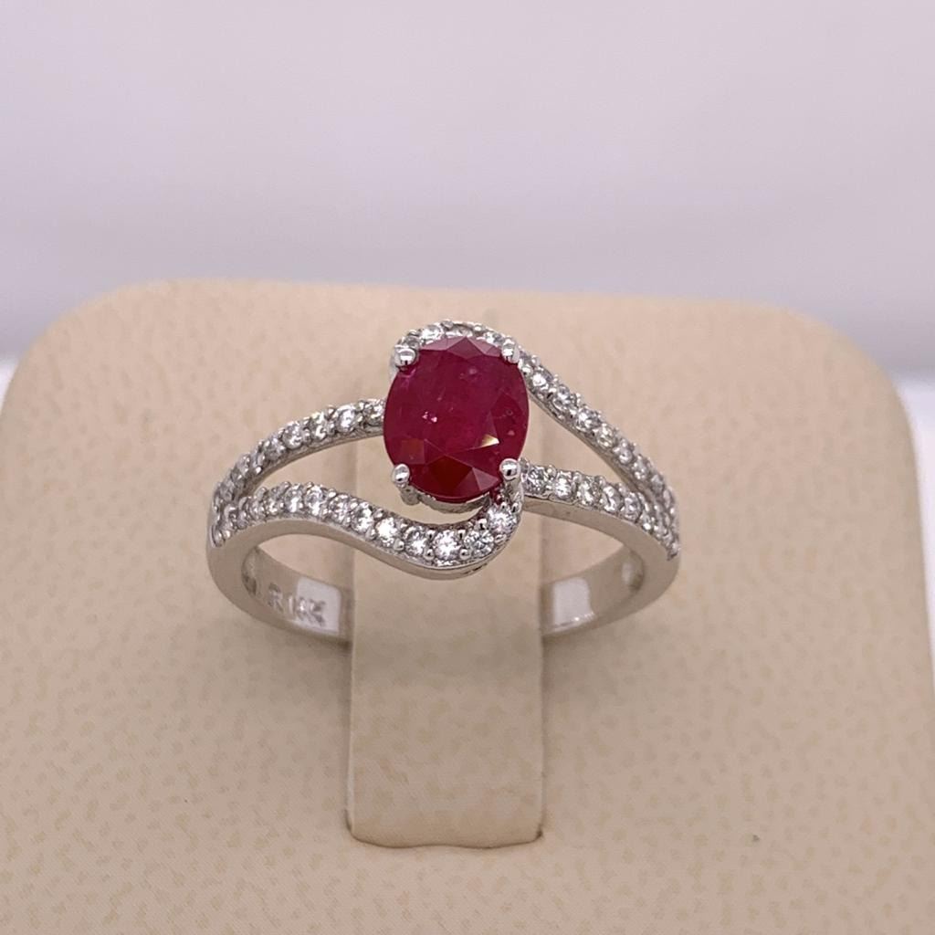 14Kt White Gold Ring. With A Single Full Cut Oval Ruby Set In The Center In A 4 Prong Setting Color - Red, Clarity - SI1 & Full Cut Round Brilliant Cut Diamonds Set Around It In A Swirl Designed Ring.