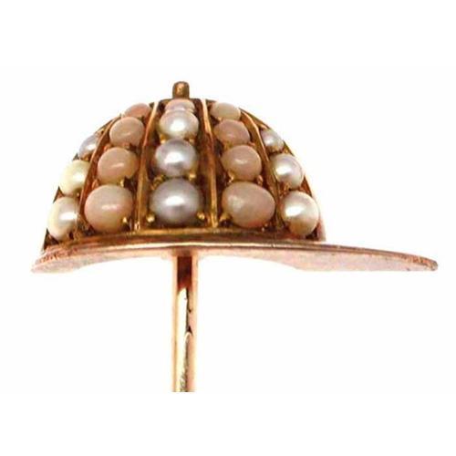The playful 14 Kt pink gold stickpin is in the form of a half-cap. The dome of the cap features alternating stripes of prong-set natural pearls and pink corals. The bill is richly textured. The