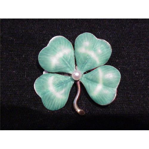 Wonderful 14Kt Yellow gold matte finish green enamel and pearl 4-leaf clover brooch in fantastic condition. Reverse: Safety catch ball hinge. Great piece.