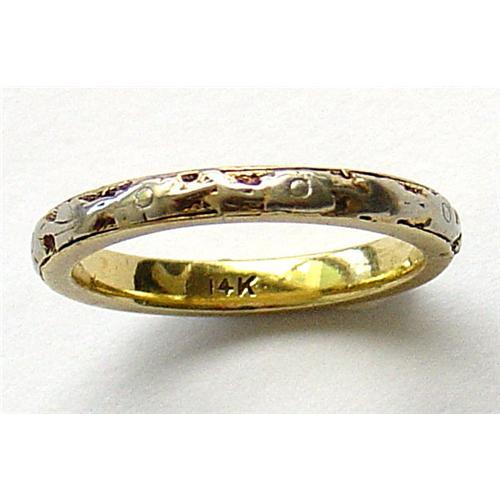 This elegant, slim band features scrolling strongly delineated floral motifs in contrasting white and yellow color. Marked "14K" on reverse.