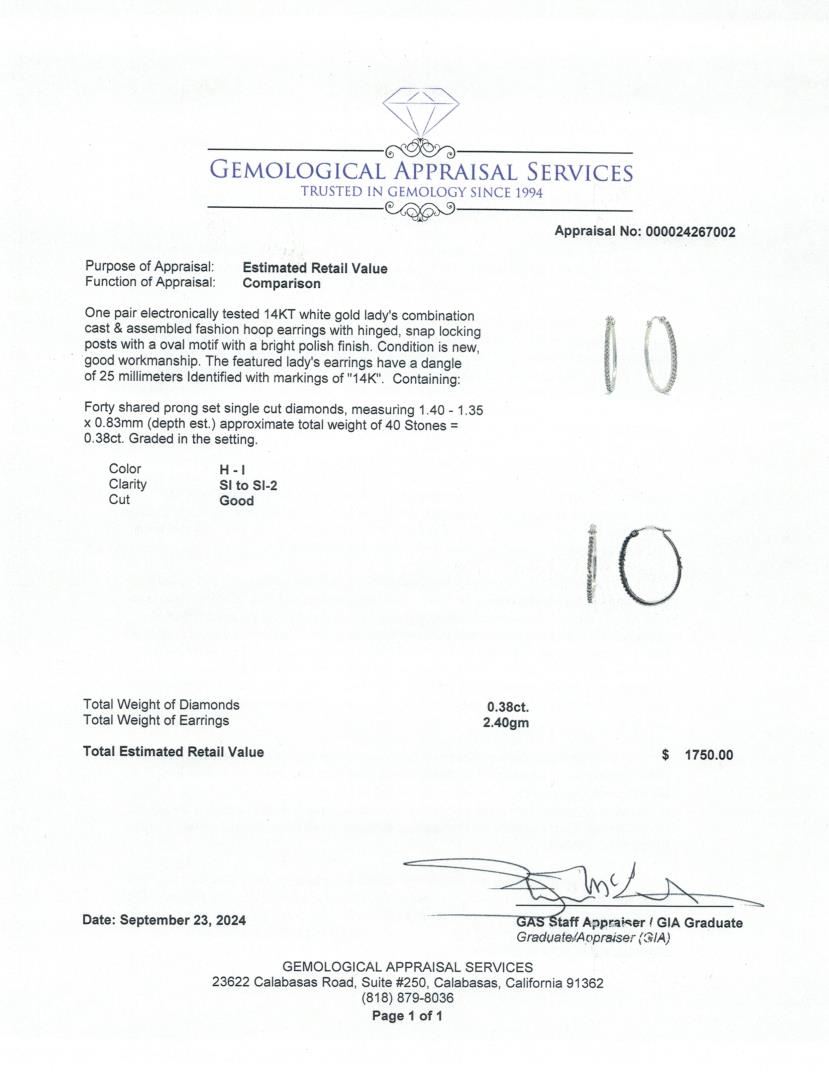 This pair of 14KT white gold hoop earrings features a sleek, oval motif with a dangle of 25mm. It is adorned with forty prong-set single cut diamonds totaling 0.38ct, with H-I color, SI-1 to SI-2 clarity, and a good cut. The total weight of the earrings is 2.40 grams.