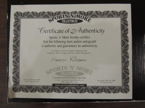 14X11 MATTED BASEBALL PHOTO AUTOGRAPHED HARMON KILLEBREW. INCLUDES COA FROM SPORTS N MORE. AS SHOWN. VIEW PICTURE FOR DETAIL. PLEASE BE ADVISED, AND INFORMED REGARDING SIGNATURES OR AUTOGRAPHS THAT WE SELL AT AUCTION: WE ARE NOT AUTHENTICATORS, AND WE DO NOT AUTHENTICATE, OR VALIDATE ANY AUTOGRAPHS OR SIGNATURES THAT WE OFFER AT AUCTION. SOME AUTOGRAPHS OR SIGNATURES MAY COME WITH AN AUTHENTICATION FROM ANY ONE OF LITERALLY HUNDREDS OF AUTHENTICATORS ACROSS THE COUNTRY, AND AROUND THE WORLD. WE DO NOT ENDORSE ANY AUTHENTICATOR, NOR DO WE GUARANTEE THAT ANY AUTOGRAPH OR SIGNATURE IS AUTHENTIC, OR THAT IT WILL PASS AUTHENTICATION BY ANY AUTHENTICATOR. ALL AUTOGRAPHS OR SIGNATURES ARE SOLD