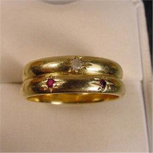 14 ct yellow gold ring, made from two bevelled bands joined together to make one ring. The face of one ring is set with two small stones, probably rubies. The other ring is set with what I think was a single small diamond - but this has been badly grazed, and needs to be replaced. Inside one band is faintly engraved ?J.L.? This is an estate ring, and was the two wedding rings of a husband and wife - after the wife?s death, the husband had the rings joined. Band is now 7 mm deep (1/4 inch). The stones are approx. 1 mm diameter each. This ring has been worn for many years, and the red stones are a little abraded (can be seen under a loupe, not obvious to the naked eye), and as mentioned previously, the diamond needs to be replaced - not an expensive job. The ring is quite heavy, and a very attractive item. The fitting is English size S (USA size 9.1/4).