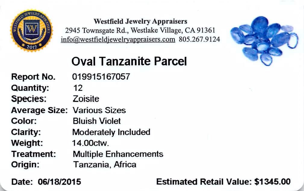 Twelve oval mixed cut natural tanzanites exact total weight 14.00ct., clarity is moderately included, type I, medium, very slightly grayish, bluish violet color, (GIA bV 5/3), cut is good. Transmitting light with a minimum of distortion, transparent. Naturally occurring internal & external characteristics are present. Color grade is an average for the group. Tanzanite is a very rare gemstone that is only found in the country of Tanzania. Originally discovered in 1967. Tiffany & Company, named the stone Tanzanite. It is found in the Usumburu Mountains that border the Umba Valley of northern Tanzania. Tanzanite occurs in gray, brown, violet, blue, reddish-purple, & green. The gem is interesting because of its exceptional pleochroism. Rotated in different directions a tanzanite will exhibit multiple changes of color. Tanzanite has a low tolerance to ultrasonic cleaning, and should not be cleaned using this method. Westfield Appraised at $1,345.00.