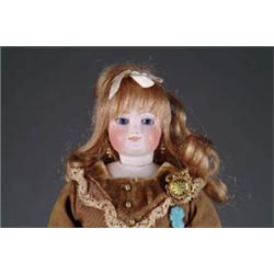 14” SWIVEL NECK FRENCH FASHION. A finely detailed cabinet-size swivel neck French fashion with cobalt blue eyes and pail bisque on a gusseted kid French-fashion body. This finely costumed (recent vintage) fashion also has a replacement blonde wig. CONDITION: Overall condition is very fine. Pin head light red spot on forehead under wig. 1-2276