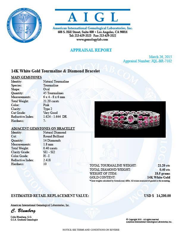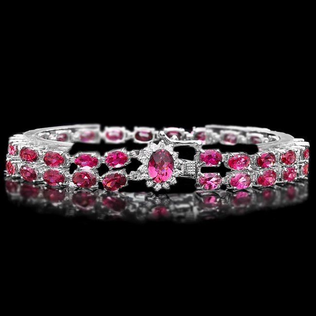 Retail: $14,200.00 ****** 14k 21.2ct Tourmaline 0.40ct Diamond Bracelet ****** Metal: 14k Solid White Gold / Size: 7.5 / Total Item Weight: 18.5 grams / Country Made: United States / / Main Stone: Tourmaline / Color: Pink / Carat Total Weight: 1.20 / Treatment: None / Clarity: Type 2 / Cut: Very Good / / Secondary Stone: Diamond / Carat Total Weight: 0.40 / Treatment: None / Color Grade: H - I / Clarity: SI1 - SI2 / Cut: Very Good / / Side Stone: Tourmaline / Color: Pink / Carat Total Weight: 20.00 / Treatment: None / Clarity: Type 2 / Cut: Very Good /