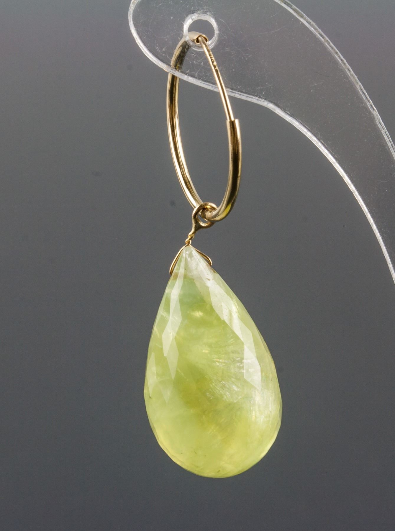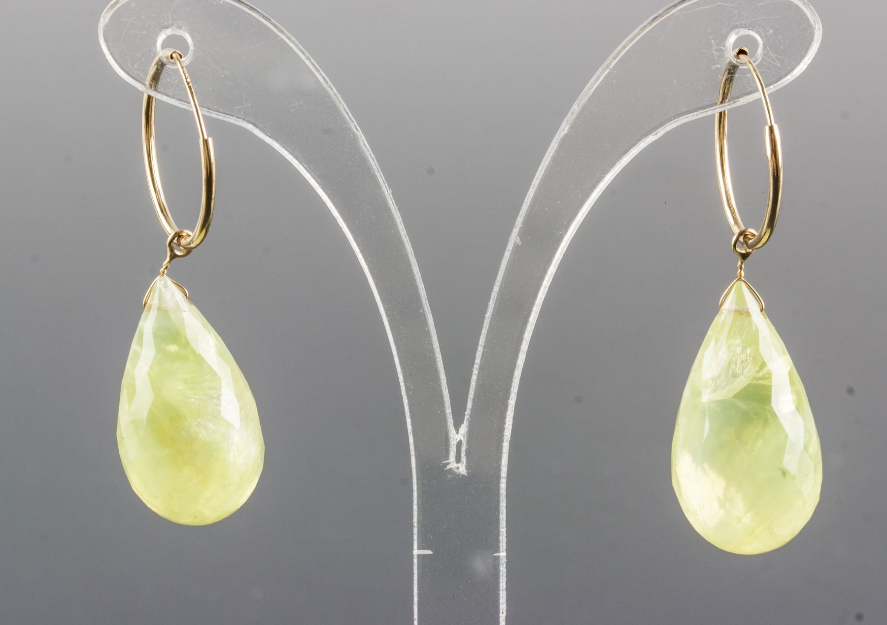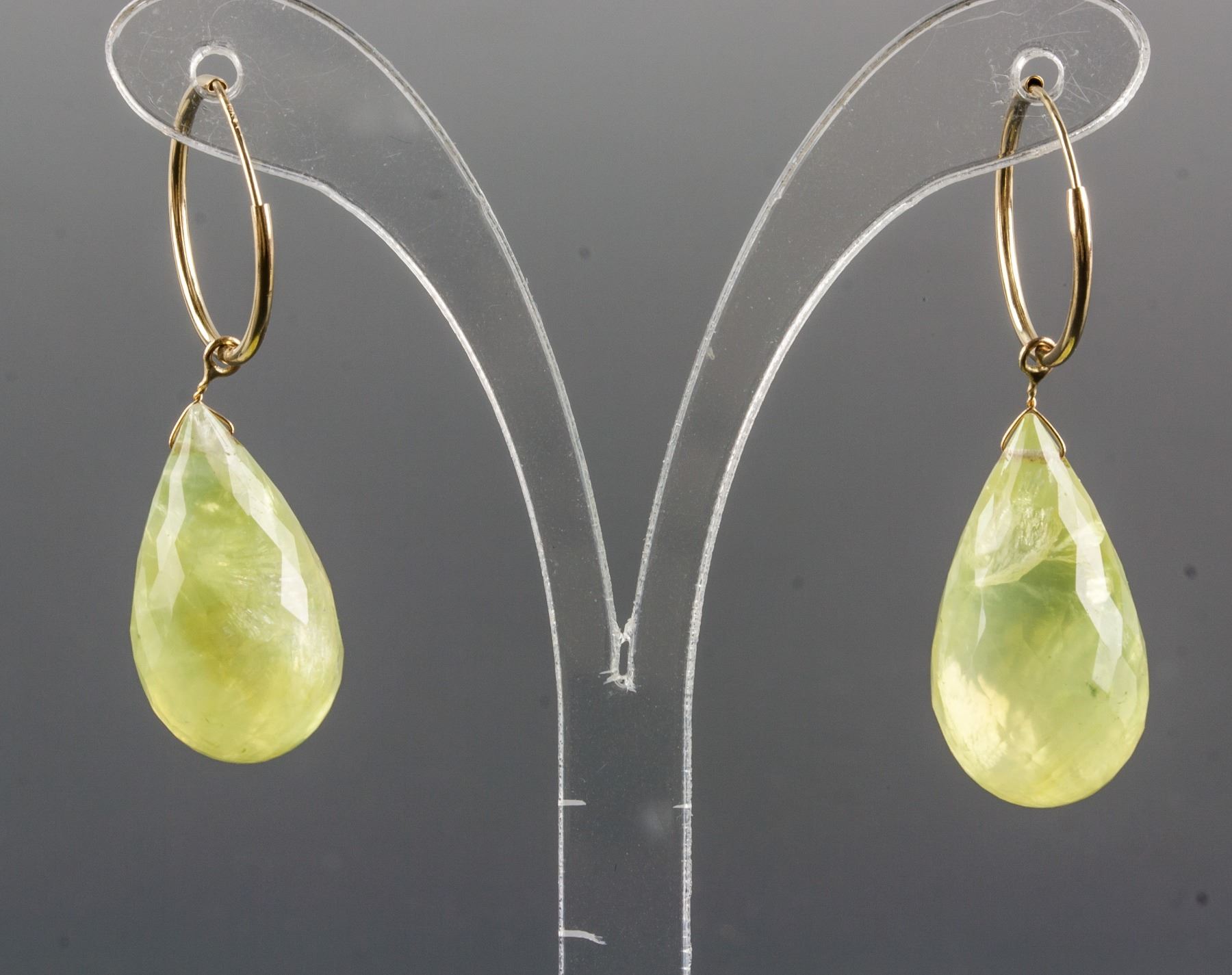 Stamped 14k yellow gold hoop earrings; set with 2 briolette cut yellow quartz; retail value $650