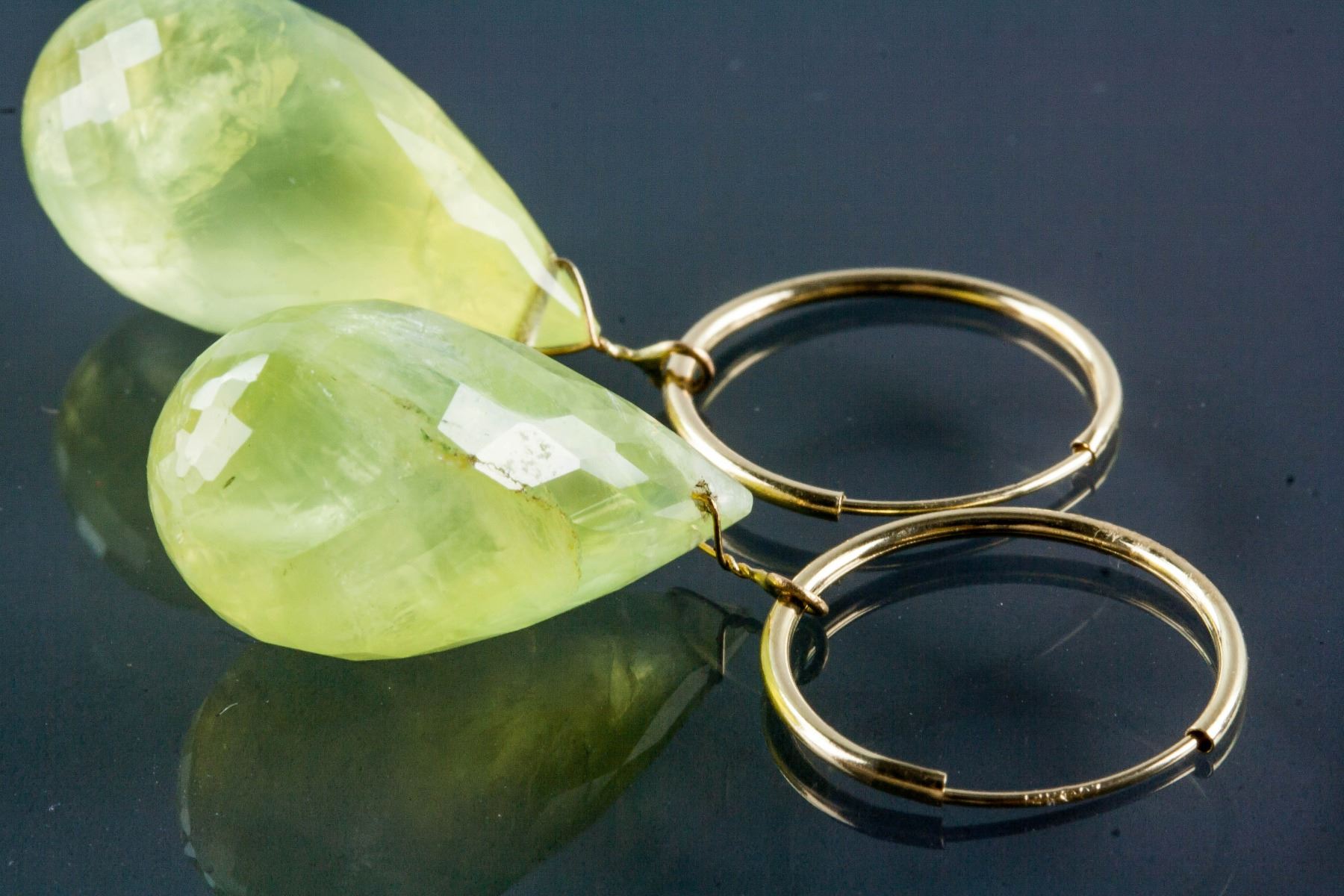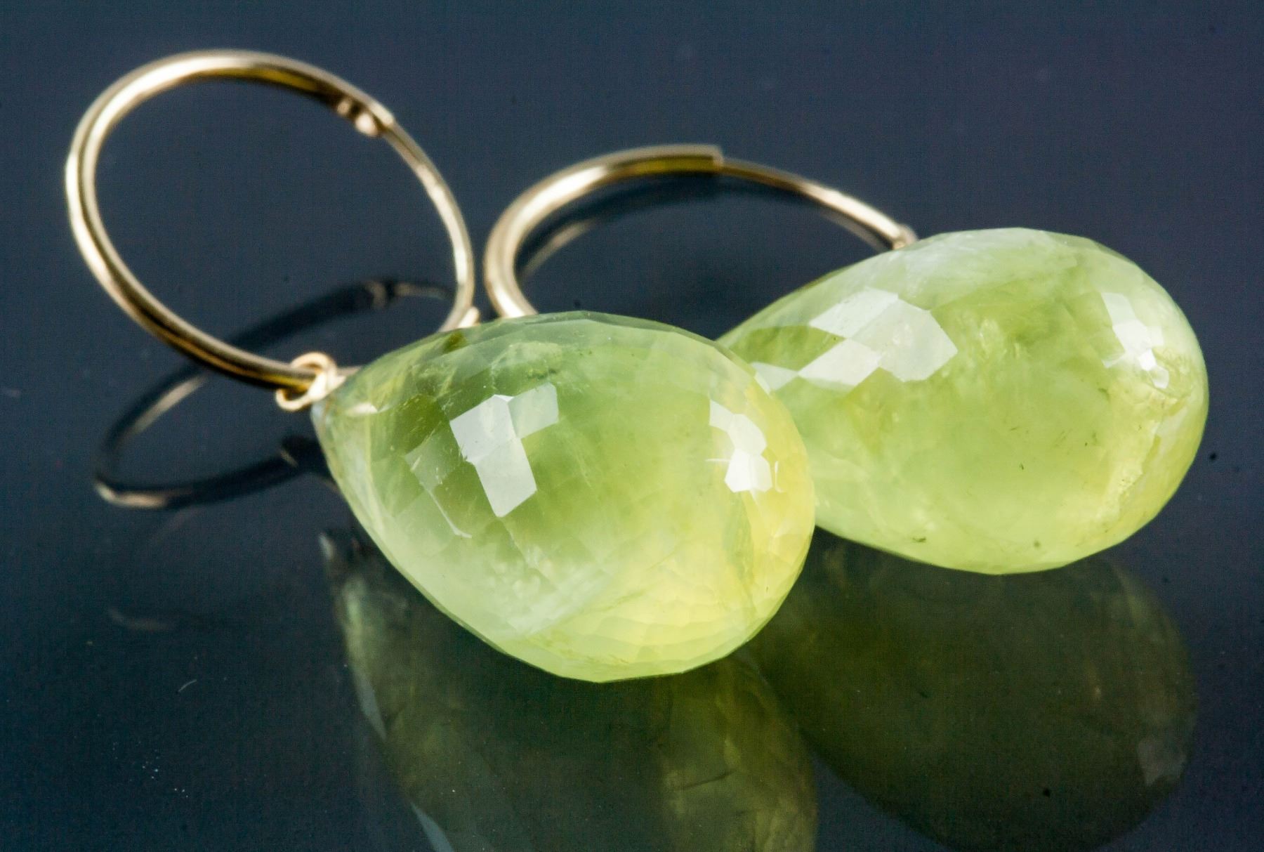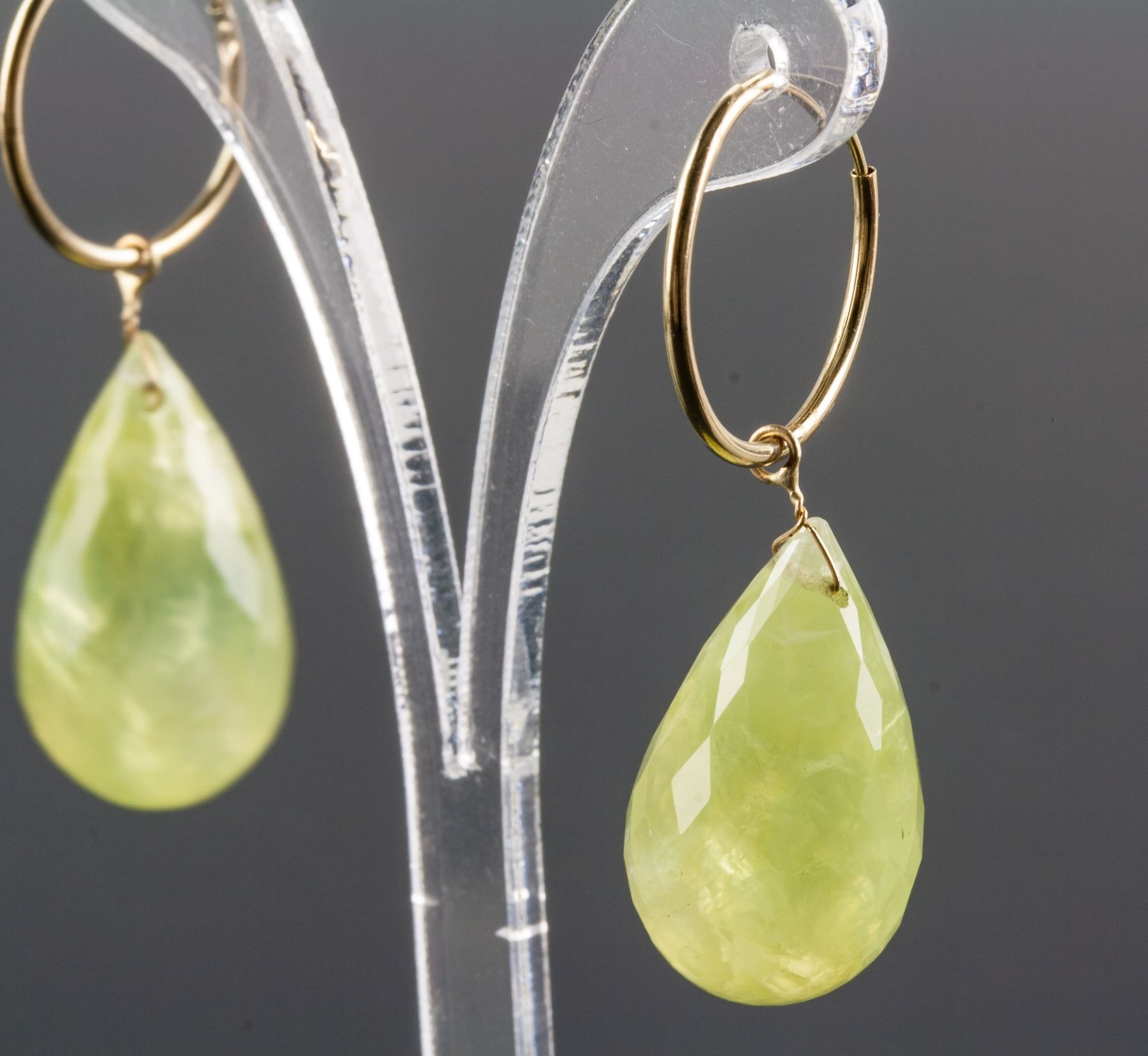 Stamped 14k yellow gold hoop earrings; set with 2 briolette cut yellow quartz; retail value $650