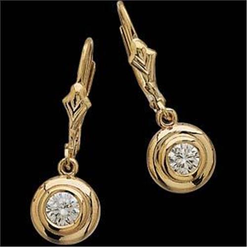 14k Yellow Gold Earrings each set with a SPARKLING round DIAMOND dangling! The Diamonds are each set in a Gold Bezel and they are well matched, FINE 'H' Color and 'I1' Clarity. The Diamond Total Weight = .50 CARATS! The Earrings have Gold Leverbacks for pierced ears. They are gorgeous!