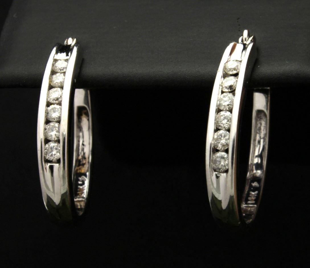 12 Brilliant Cut Diamonds approx. weight 0.50 carats clarity SI and color H-I. The diamonds are channel set for great security. The hoops are almost 1 inch long. 4.8g