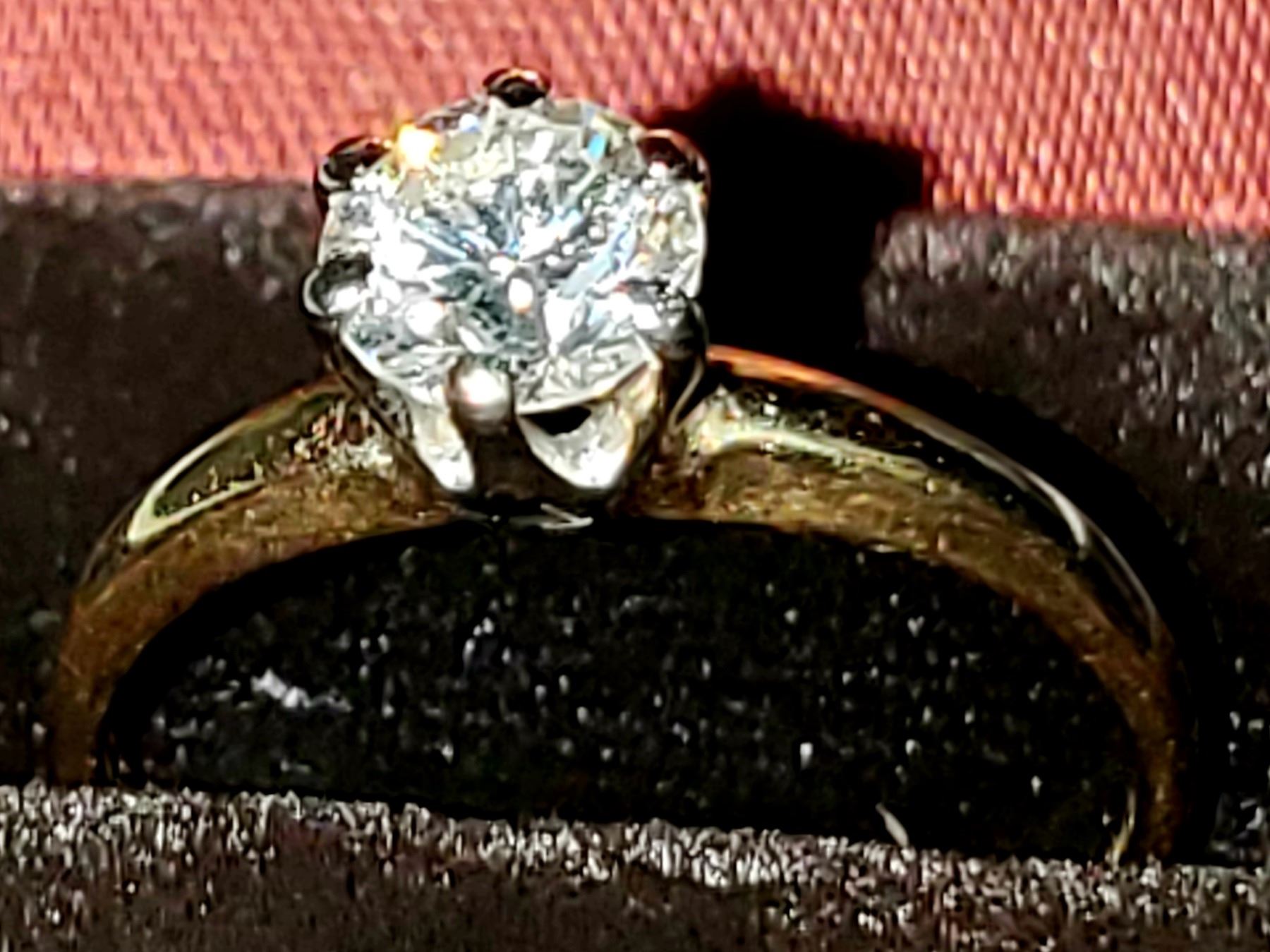 14k Diamond Ring. This .90 Ct Round Center Stone engagement ring sparkles and shines. The SI2 single stone has I Color and an overall eye appeal factor that will make that special someones smile shine brighter than the ring. Size 7.5