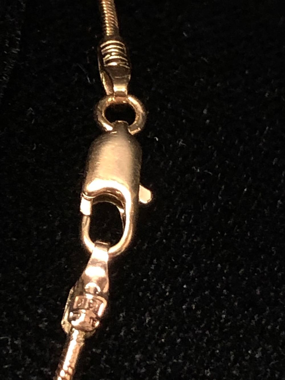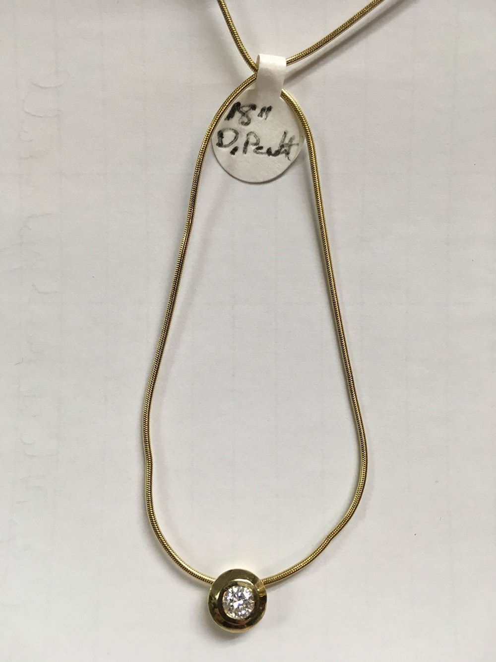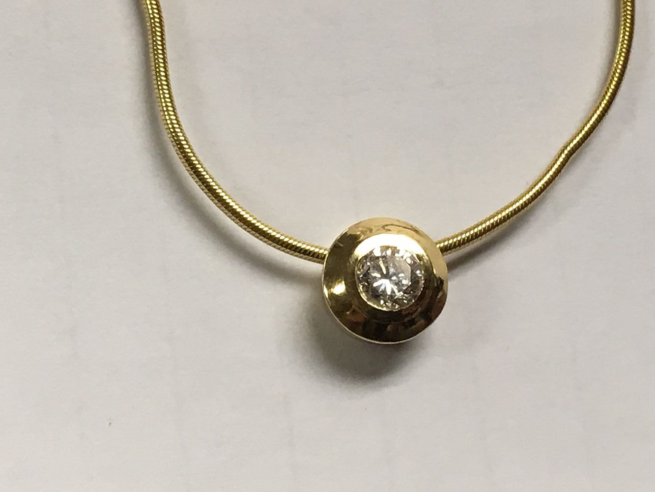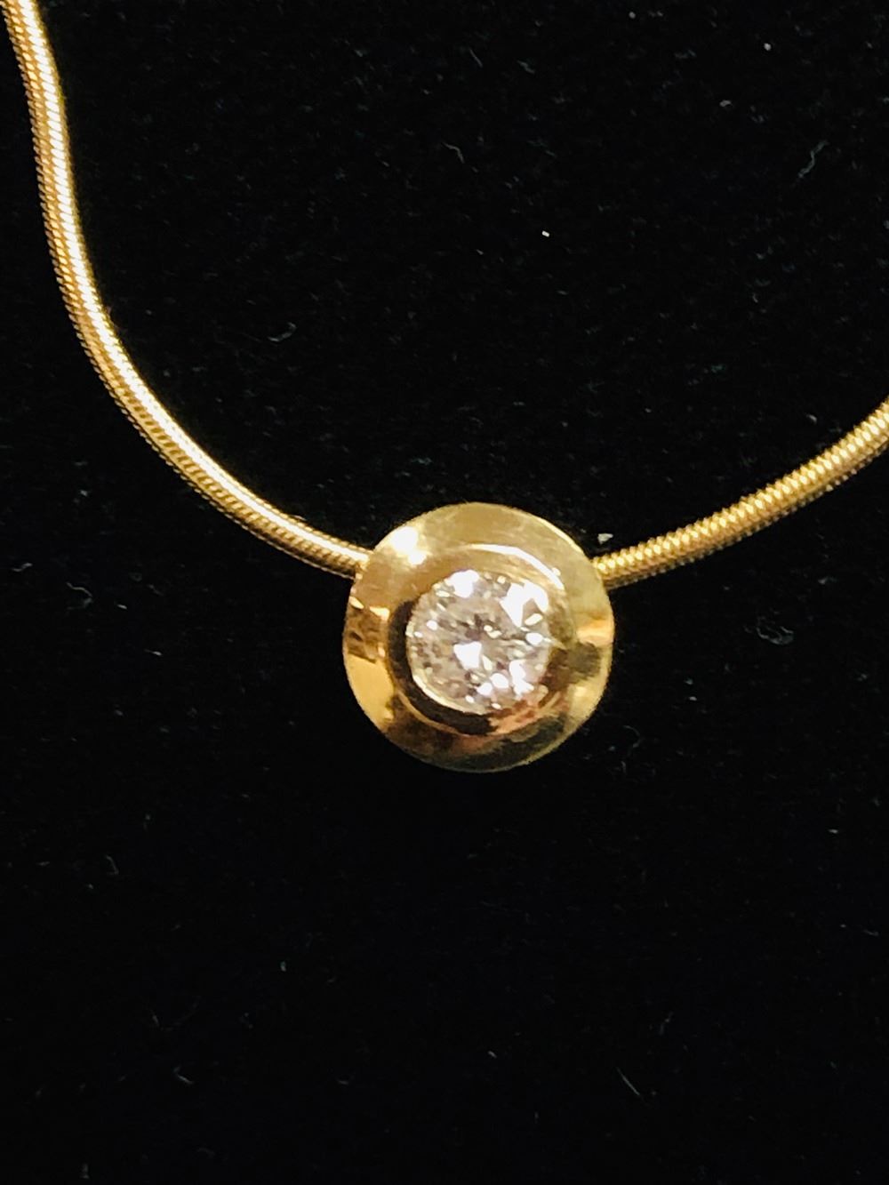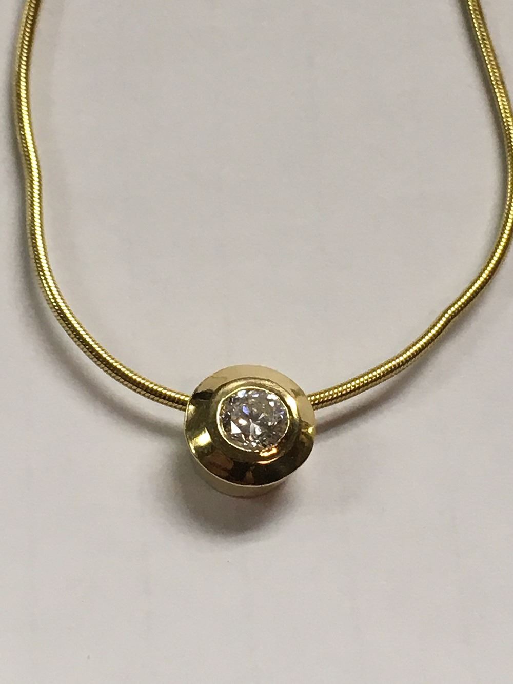 14k Diamond solitaire diamond "doughnut" style 14k yellow bezel setting with 18.25 inch snake chain w/lobster clasp. Appro 5mm (0.47 ct) round, brilliant cut in the I-J color range - SI3 clarity.