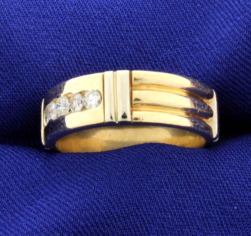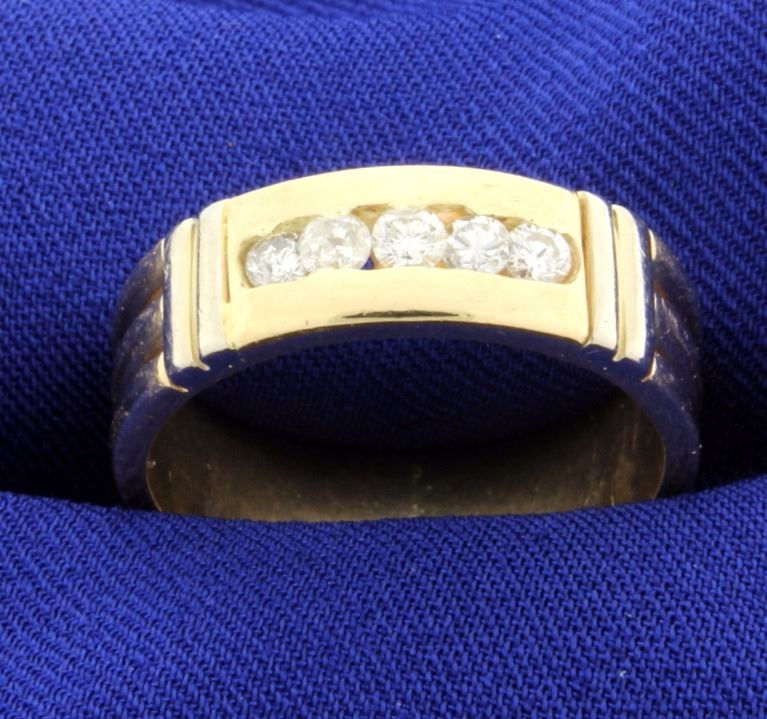 14k Diamond 7mm band. There are 5 brilliant cut diamonds. Total diamond weight 0.33 carats. (1/3 cts) clarity I-1/2. Color "H-I-J". Size 10 1/2. 9.1gr