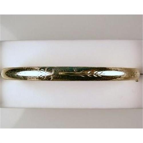 14k Yellow Gold Bangle Bracelet 3/16 inch wide. Opens so you can slip it on easily. Florentined brushed gold finish - brand new condition.
