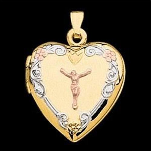 The Locket itself is Yellow Gold, and the scrollwork is White Gold with Rose Gold Flowers.The Christ figure is Rose Gold as well. This Heartshaped Locket measures 20.5mm x 19.5mm and it IS in Mint condition.