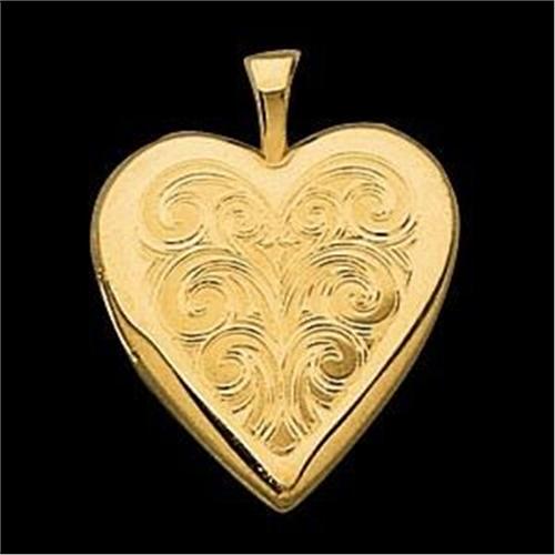14k Yellow Gold HEART LOCKET Pendant featuring exquisite embossing on the front of the Locket. It measures 21mm across and opens for photos.