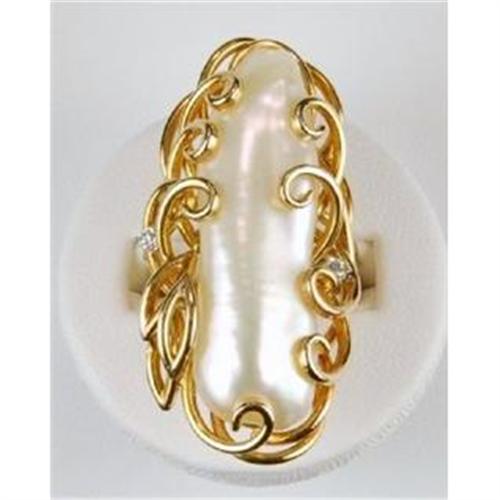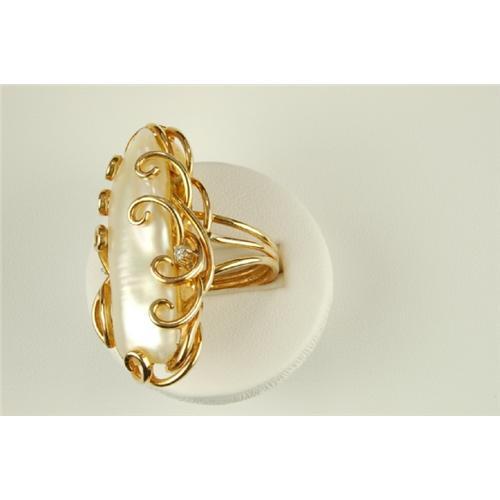 Beautiful 14k Yellow Gold Custom Made ring featuring a gorgeous Mother of Pearl accented by 2 Diamonds. This Mother of Pearl is 1 1/2" in length and it sits in a 14k Gold setting that was custom made for it. The ring is a Size 7 and I can resize it for you.