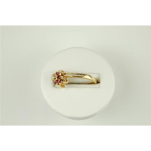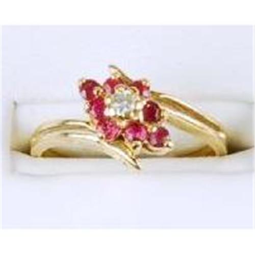 14k Yellow Gold ring featuring a round sparkling Diamond = .10 Carats! The Diamond is surrounded by 8 round Rubys in a bypass design. This pretty Diamond and Ruby ring is a size 6 1/4 and I can resize it for you.