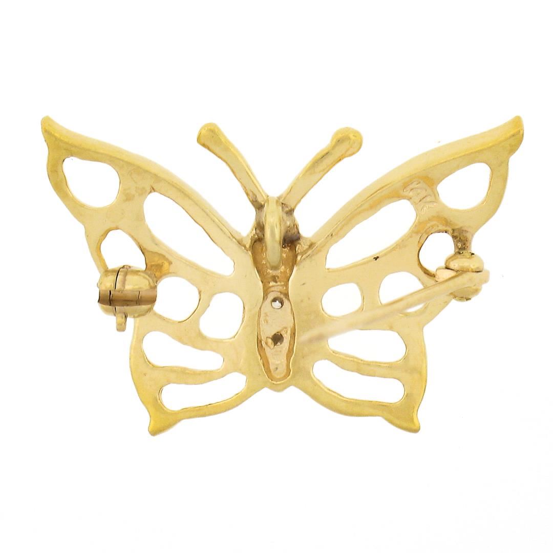 A solid 14k yellow gold brooch pendant, with 3 round cut natural diamonds (G/H - VS1-VS2 ; 0.09ctw). Measures 17.2x25.3mm and weighs a total of 3.25 grams, and inside bail measurement 2.2mm.