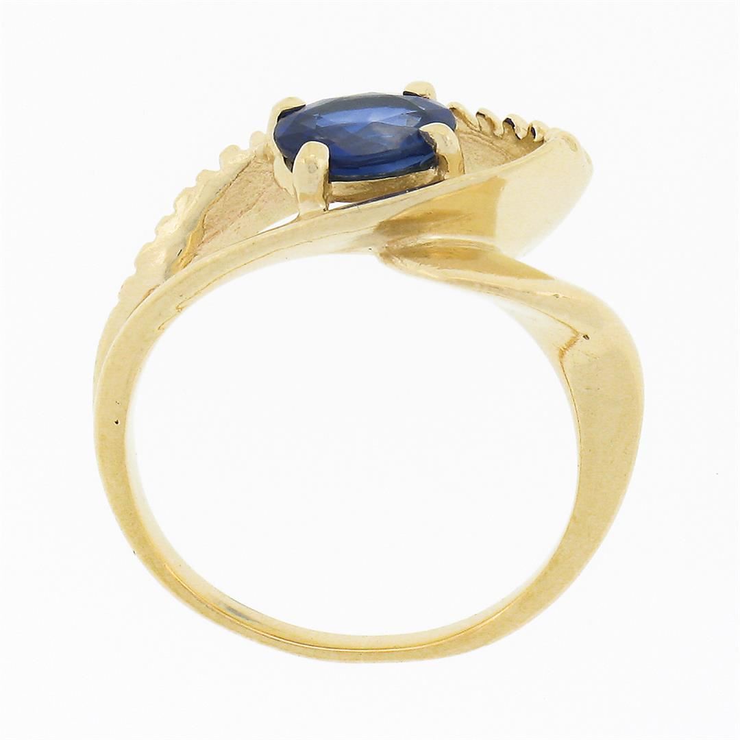 A solid 14k yellow gold ring, with 1 oval cut natural sapphire (0.80ct). The ring is size 4.0, weighs a total of 3.78 grams, and measures 11.90mm wide.