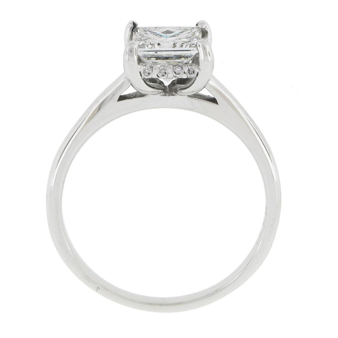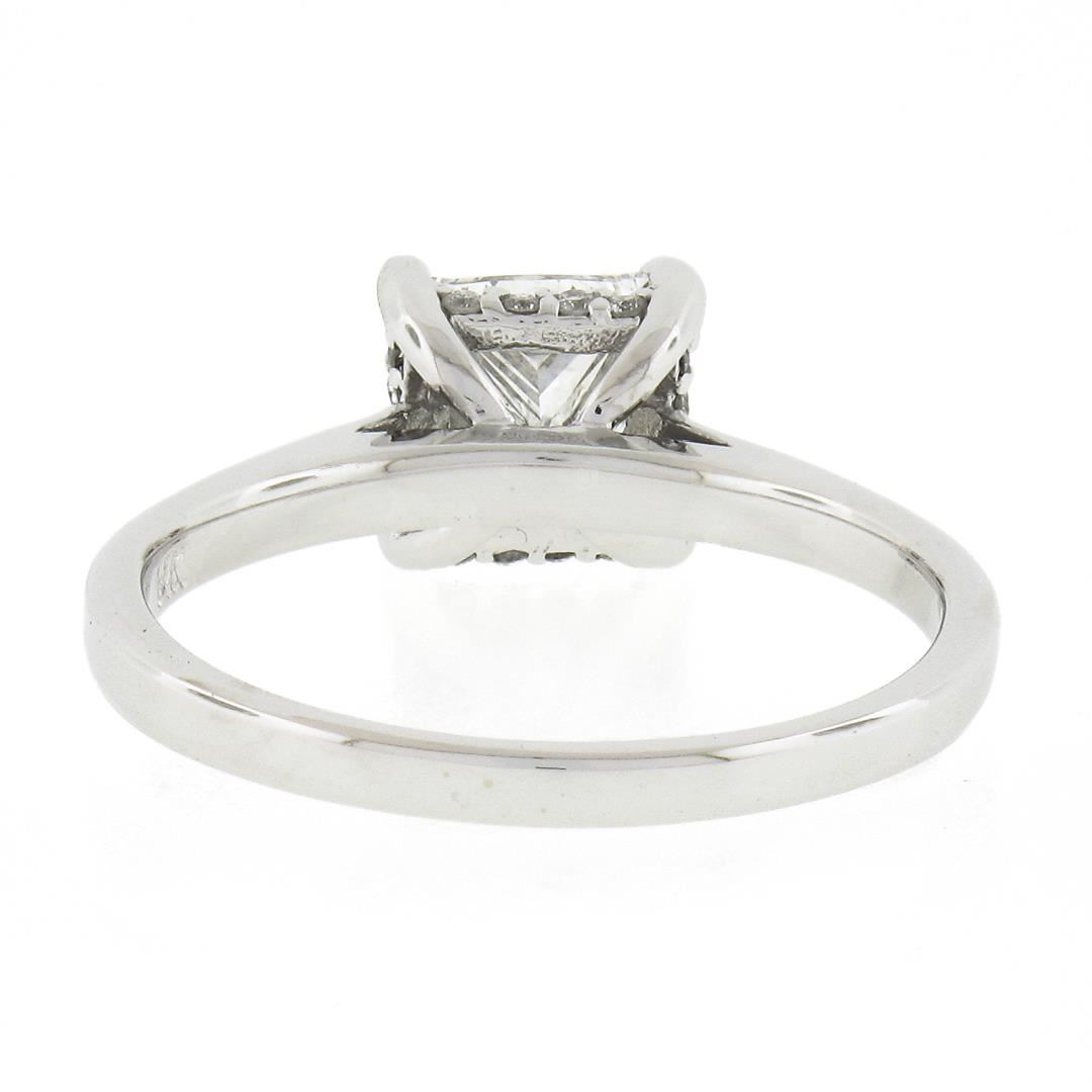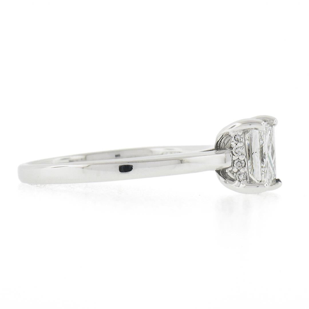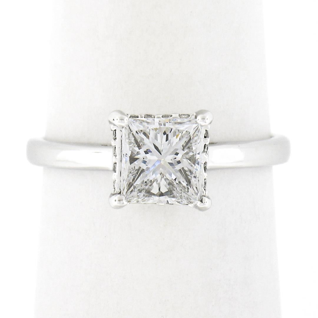 A new solid 14k white gold engagement ring, with 1 GIA graded princess cut natural diamond (E - VS2 ; 1.02ct), and 16 round cut natural diamods (F/G - VS1/VS2 ; 0.16ctw)The ring is size 6.0, weighs a total of 2.48 grams, and measures 7mm wide. Comes with all original relevant certifications.