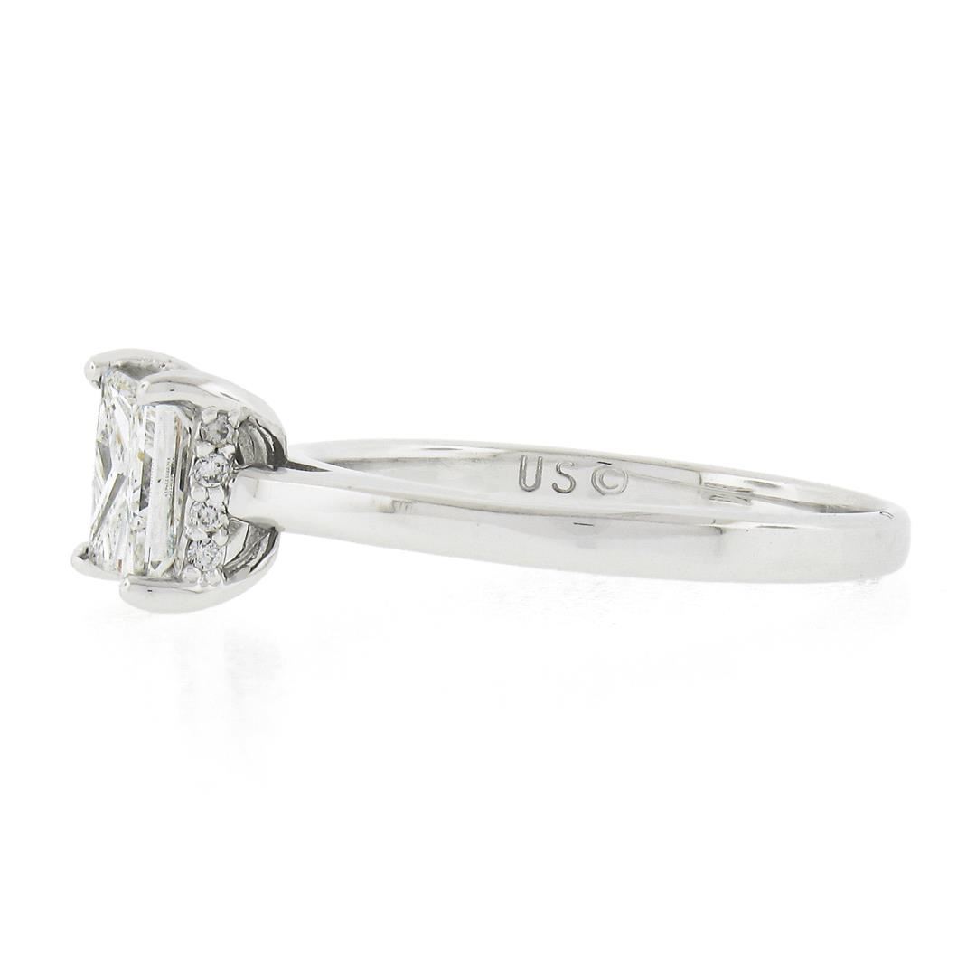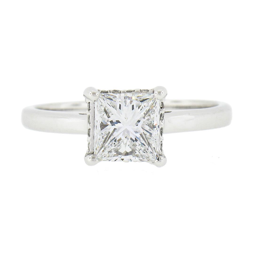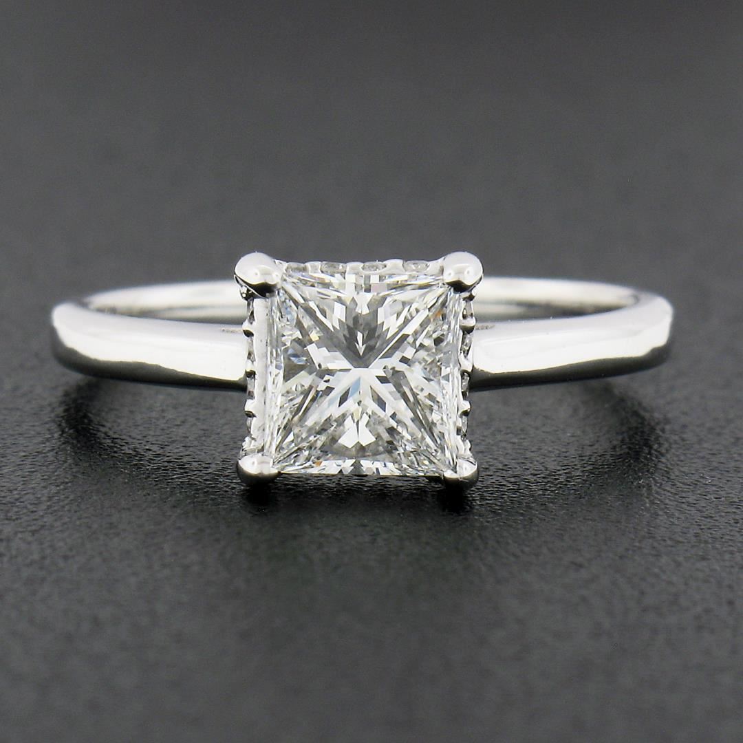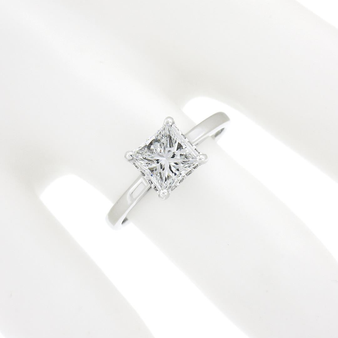 A new solid 14k white gold engagement ring, with 1 GIA graded princess cut natural diamond (E - VS2 ; 1.02ct), and 16 round cut natural diamods (F/G - VS1/VS2 ; 0.16ctw)The ring is size 6.0, weighs a total of 2.48 grams, and measures 7mm wide. Comes with all original relevant certifications.