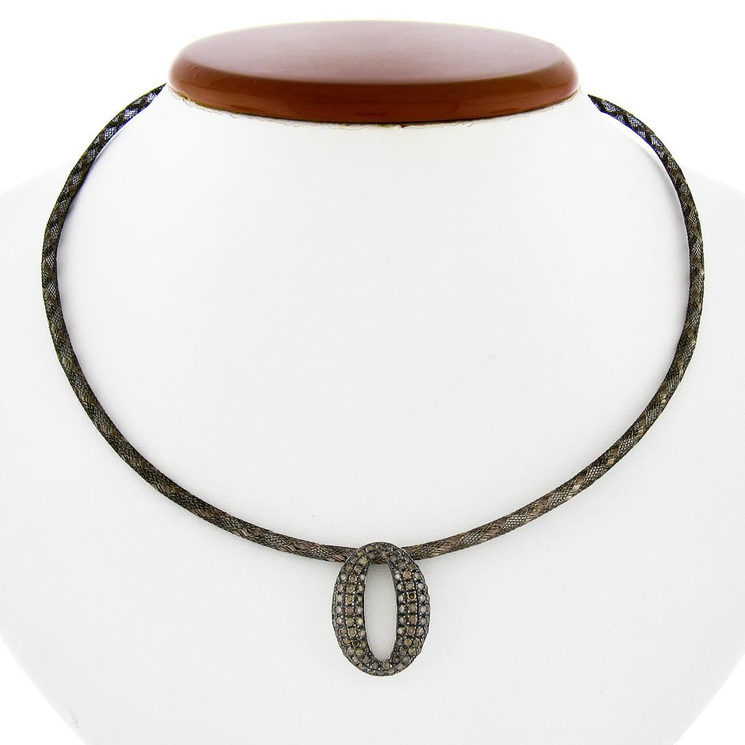 A solid 14k white & rose gold black rhodium pendant tube necklace, featuring 90 round brilliant cut natural fancy champagne diamonds (SI1/SI2 ; 1.30ctw). 16 inches w/ 3.5 inch extender mesh link chain, 6.84 grams total weight, pendant measures 21.7x16mm.