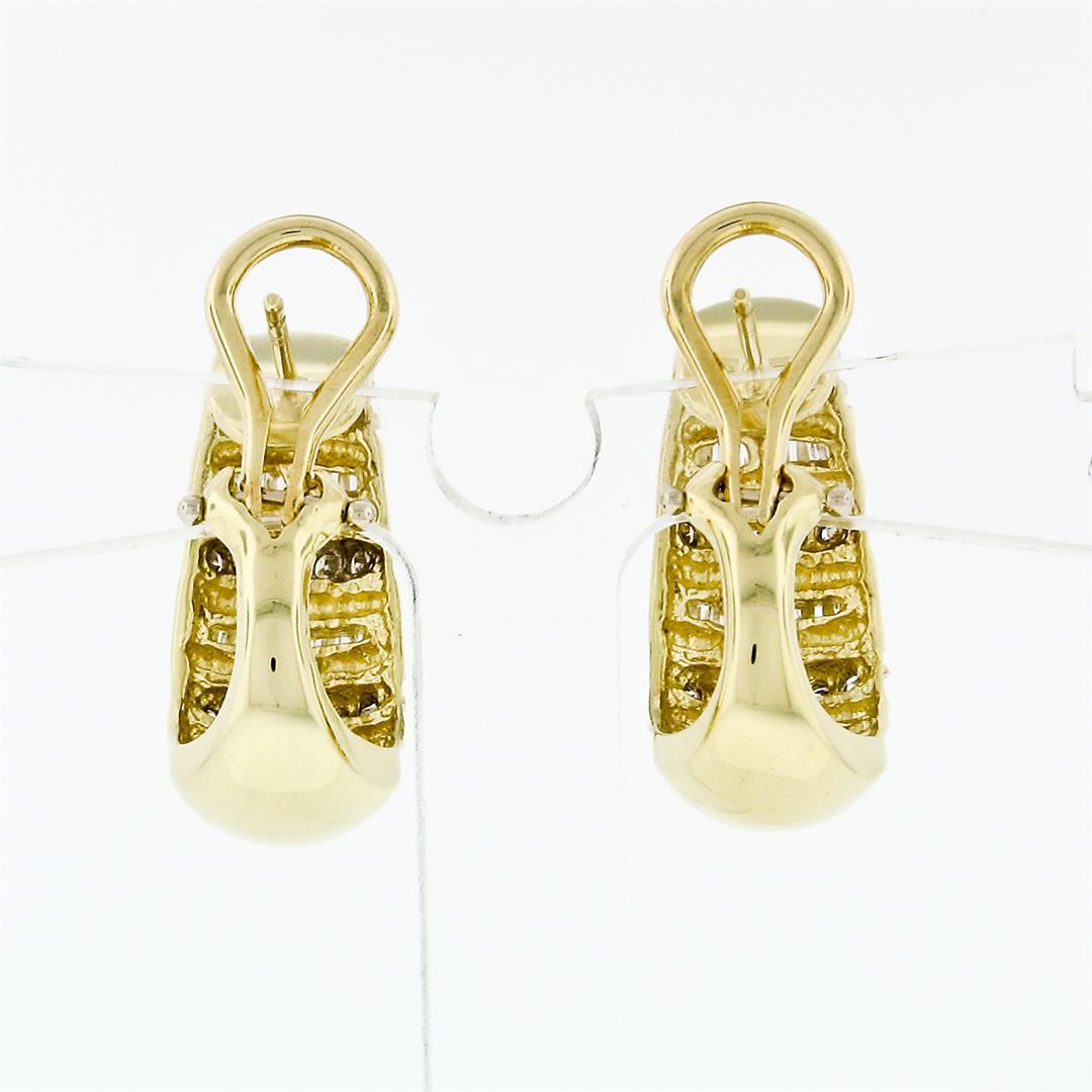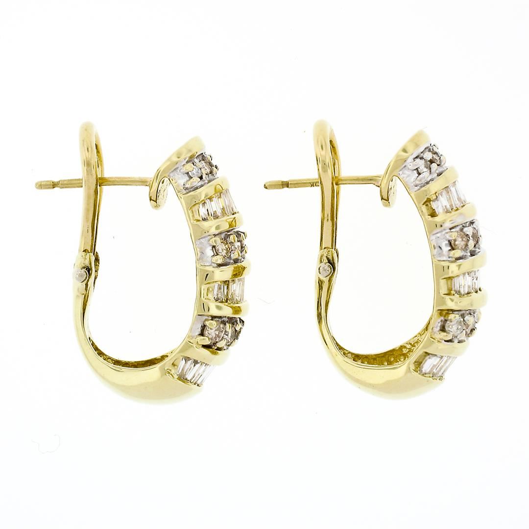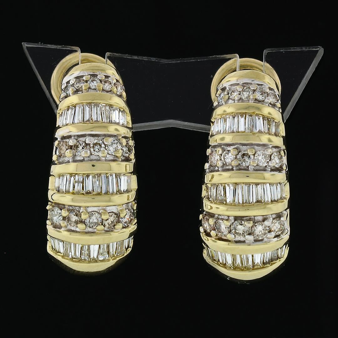 A pair of solid 14k yellow gold cuff earrings with 30 round brilliant cut natural diamonds (light champagne - SI1/SI2; 0.50ctw) alternating with 56 baguette cut natural diamonds (G/H - SI1/SI2; 1.00ctw). The earrings measure approximately 21.70x9.13mm and weigh a total of 9.32 grams.
