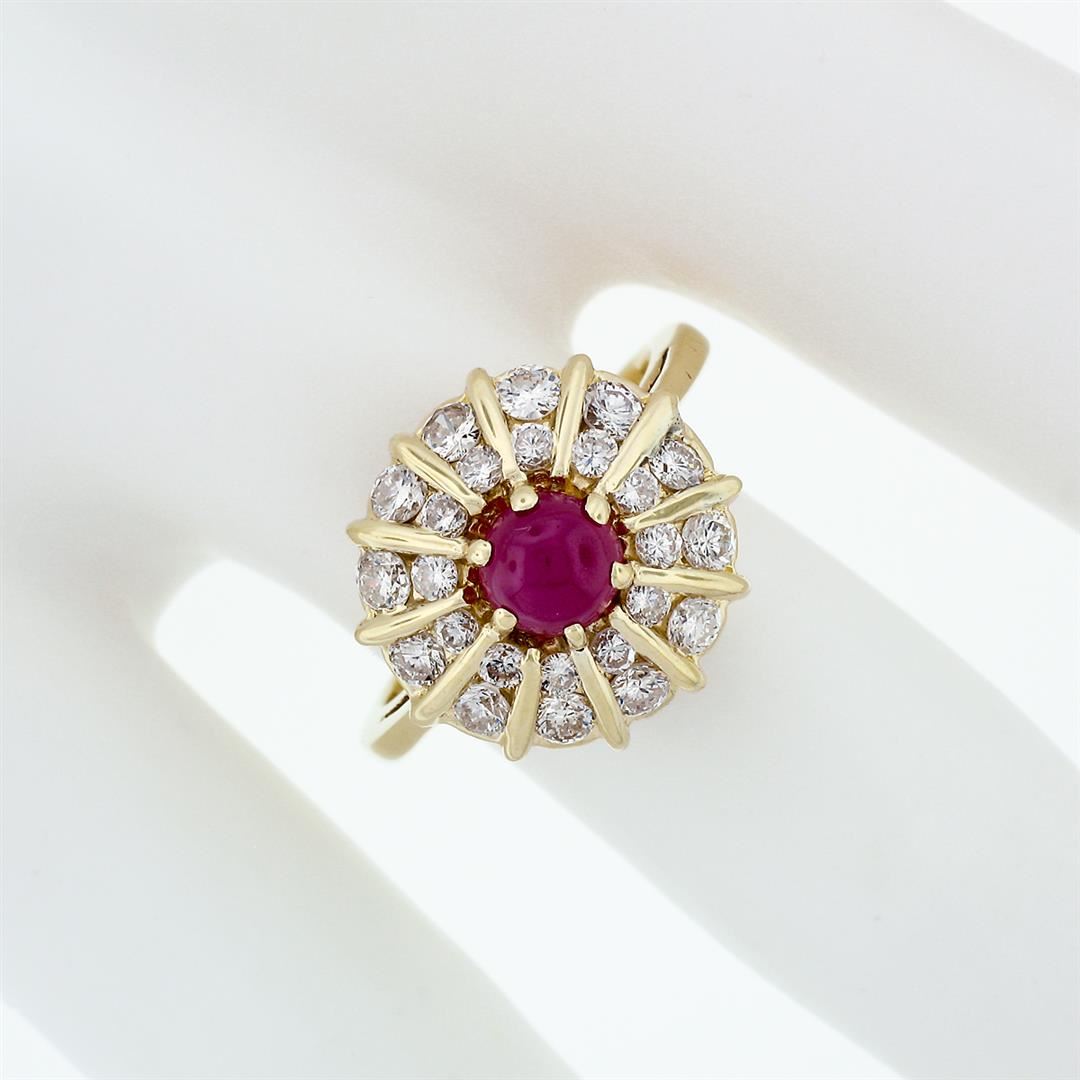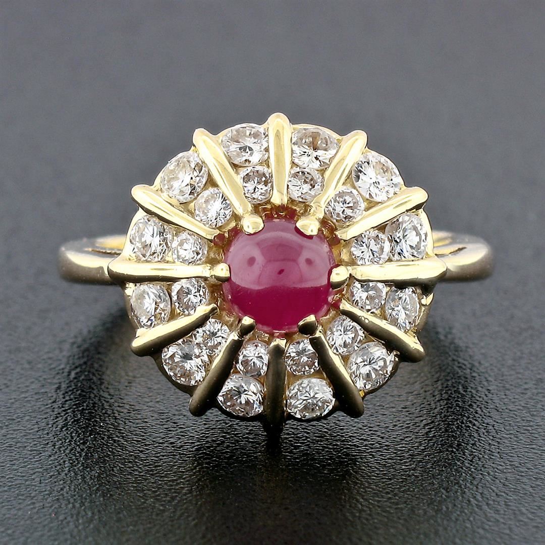 A solid 14k yellow gold platter ring, with 1 round cabochon cut natural ruby (5.2mm - 0.83ct), surrounded with 24 round brilliant cut natural diamonds (F/G - VS1/VS2; 0.84ctw). The ring is size 6.0, weighs a total of 5.73 grams, and measures 15mm wide.