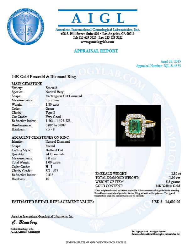 Retail: $14,600.00 ****** 14k Gold 1.80ct Emerald 1.00ct Diamond Ring ****** Metal: 14k Solid Yellow Gold / Size: 7.25 / Total Item Weight: 5.8 grams / Country Made: United States / / Main Stone: Emerald / Color: Green / Carat Total Weight: 1.80 / Treatment: None / Clarity: Type 2 / Cut: Very Good / / Secondary Stone: Diamond / Carat Total Weight: 1.00 / Treatment: None / Color Grade: H - I / Clarity: SI1 - SI2 / Cut: Very Good /