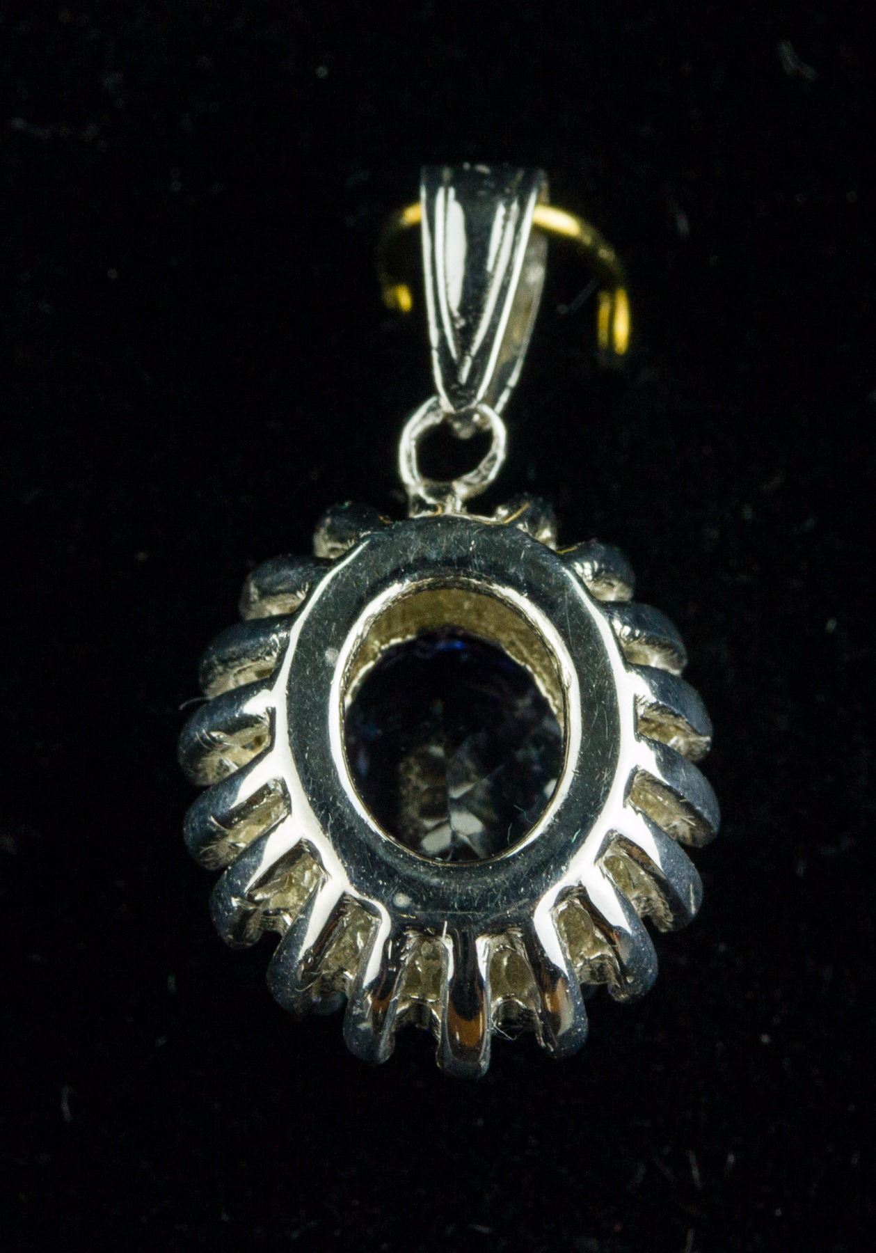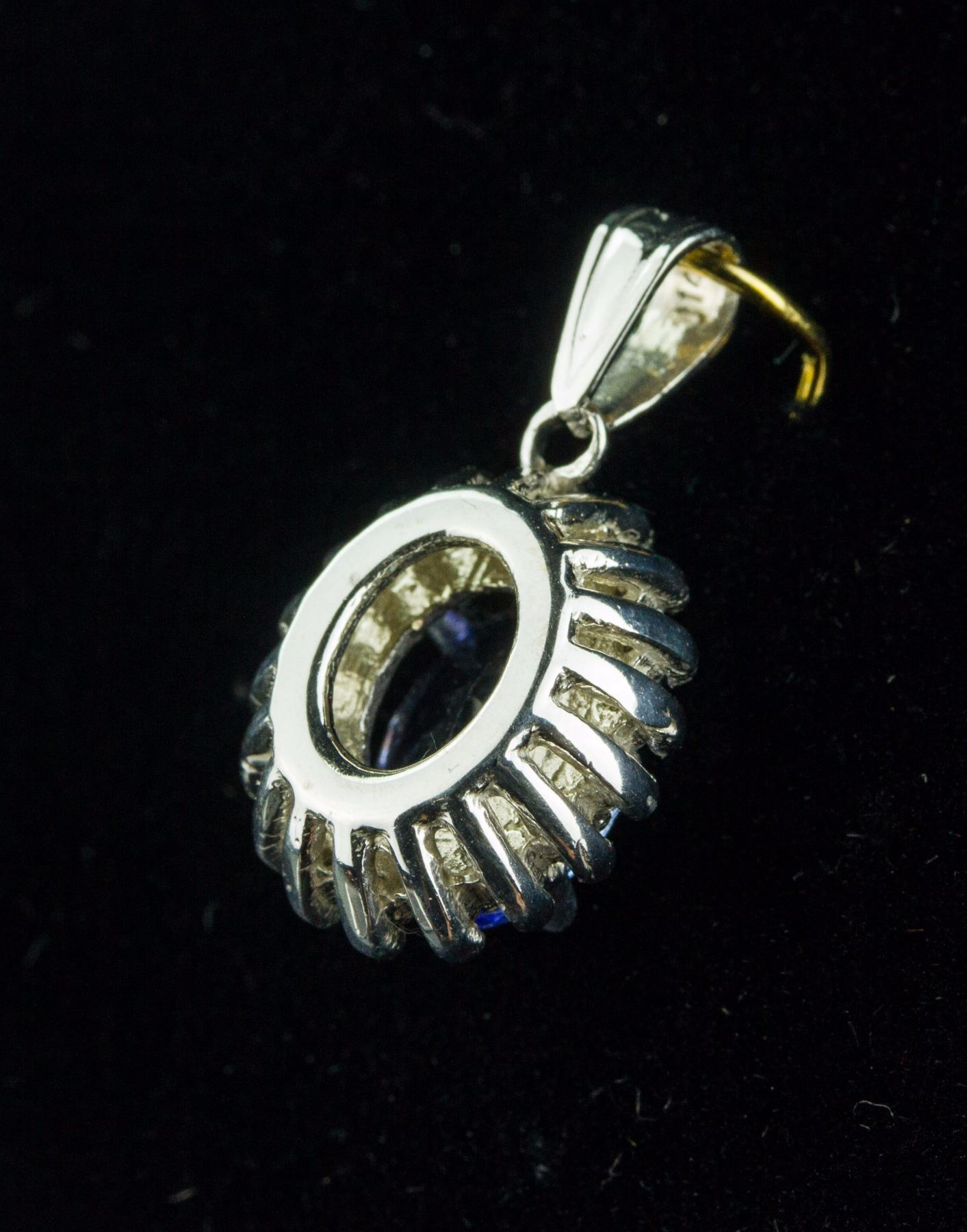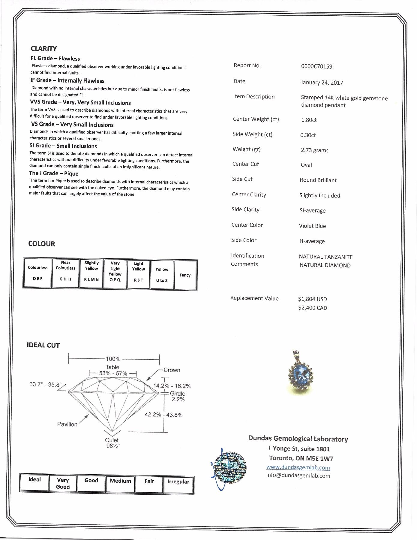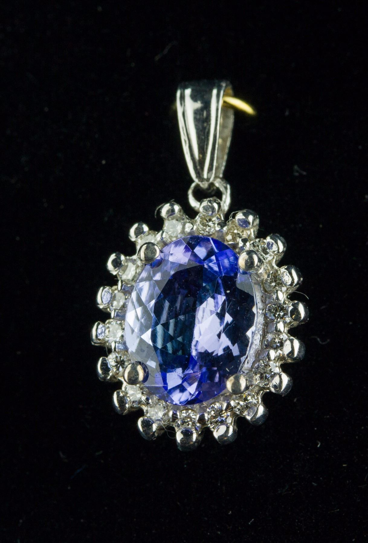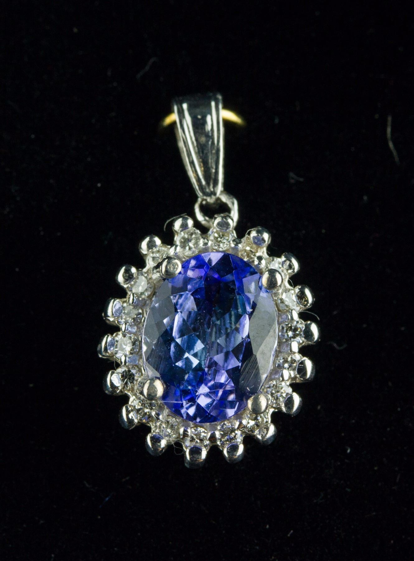 Stamped 14k white gold pendant; set with 1.80ct oval cut violet blue Tanzanite and 0.30ct round brilliant cut natural diamond; certified replacement value $2400 CAD; 2.73 grams