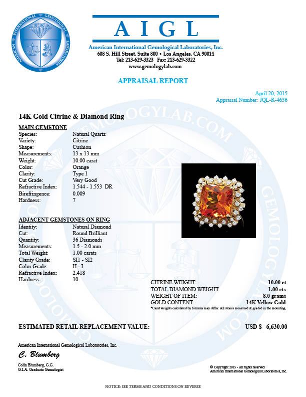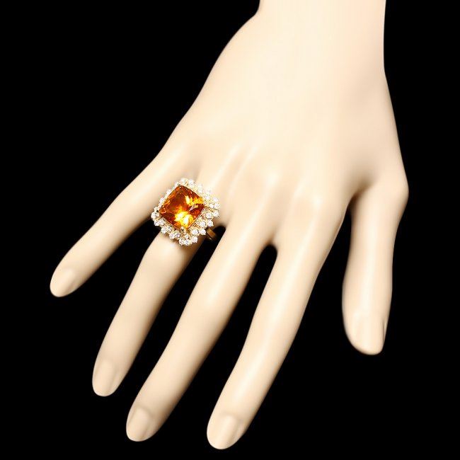 Retail: $6,500.00 ****** 14k Gold 10.00ct Citrine 1.00ct Diamond Ring ****** Metal: 14k Solid Yellow Gold / Size: 7 / Total Item Weight: 8 grams / Country Made: United States / / Main Stone: Citrine / Color: Orange / Carat Total Weight: 10.00 / Treatment: None / Clarity: Type 2 / Cut: Very Good / / Secondary Stone: Diamond / Carat Total Weight: 1.00 / Treatment: None / Color Grade: H - I / Clarity: SI1 - SI2 / Cut: Very Good /