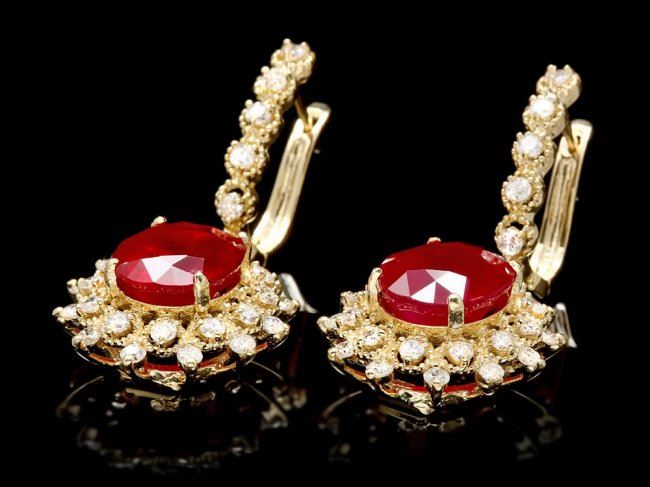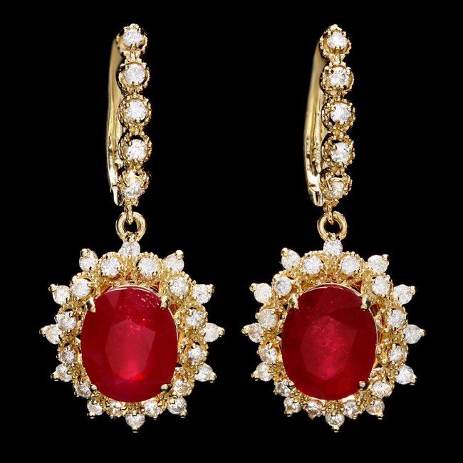 Retail: $8,900.00 ****** 14k Gold 10.00ct Ruby 1.60ct Diamond Earrings ****** Metal: 14k Solid Yellow Gold / Total Item Weight: 10.0 grams / Country Made: United States / / Main Stone: Ruby / Color: Red / Carat Total Weight: 10.00 / Treatment: Filling / Clarity: Type 2 / Cut: Very Good / / Secondary Stone: Diamond / Carat Total Weight: 1.60 / Treatment: None / Color Grade: H - I / Clarity: SI1 - SI2 / Cut: Very Good /
