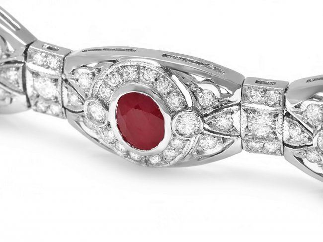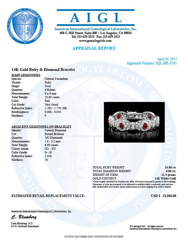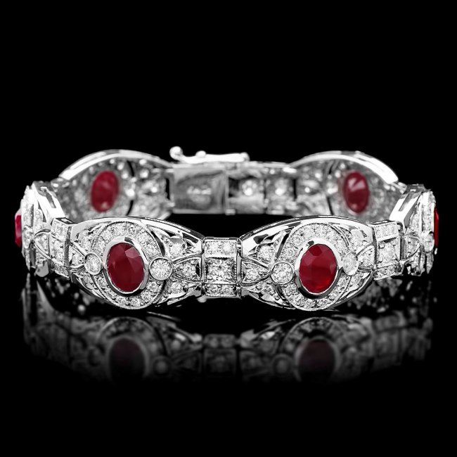Retail: $42,500.00 ****** 14k Gold 10.80ct Ruby 6.90ct Diamond Bracelet ****** Metal: 14k Solid White Gold / Size: 7 / Total Item Weight: 31.5 grams / Country Made: United States / / Main Stone: Ruby / Color: Red / Carat Total Weight: 10.80 / Treatment: None / Clarity: Type 2 / Cut: Very Good / / Secondary Stone: Diamond / Carat Total Weight: 6.90 / Treatment: None / Color Grade: G - H / Clarity: SI1 - SI2 / Cut: Very Good /