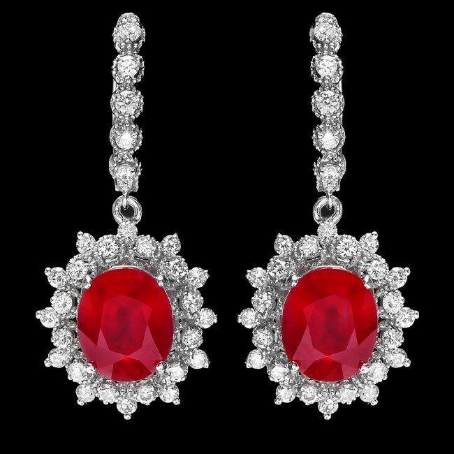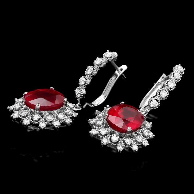 Retail: $9,800.00 ****** 14k Gold 11.30ct Ruby 1.80ct Diamond Earrings ****** Metal: 14k Solid White Gold / Total Item Weight: 9.8 grams / Country Made: United States / / Main Stone: Ruby / Color: Red / Carat Total Weight: 11.30 / Treatment: Filling / Clarity: Type 2 / Cut: Very Good / / Secondary Stone: Diamond / Carat Total Weight: 1.80 / Treatment: None / Color Grade: G - H / Clarity: SI1 - SI2 / Cut: Very Good /