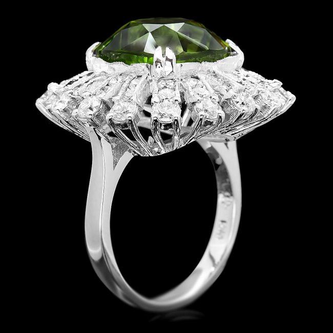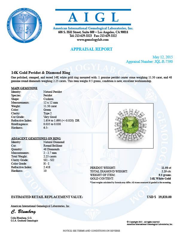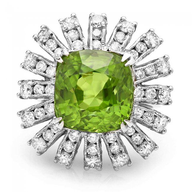 Retail: $19,700.00 ****** 14k Gold 11.50ct Peridot 2.25ct Diamond Ring ****** Metal: 14k Solid White Gold / Size: 7 / Total Item Weight: 9.5 grams / Country Made: United States / / Main Stone: Peridot / Color: Green / Carat Total Weight: 11.50 / Treatment: None / Clarity: Type 2 / Cut: Very Good / / Secondary Stone: Diamond / Carat Total Weight: 2.25 / Treatment: None / Color Grade: H - I / Clarity: SI1 - SI2 / Cut: Very Good /