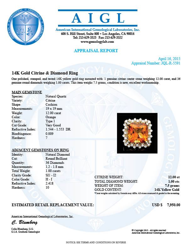 Retail: $7,890.00 ****** 14k Gold 12.00ct Citrine 1.00ct Diamond Ring ****** Metal: 14k Solid Yellow Gold / Size: 6.75 / Total Item Weight: 7.5 grams / Country Made: United States / / Main Stone: Citrine / Color: Orange / Carat Total Weight: 12.00 / Treatment: None / Clarity: Type 2 / Cut: Very Good / / Secondary Stone: Diamond / Carat Total Weight: 1.00 / Treatment: None / Color Grade: H - I / Clarity: SI1 - SI2 / Cut: Very Good /