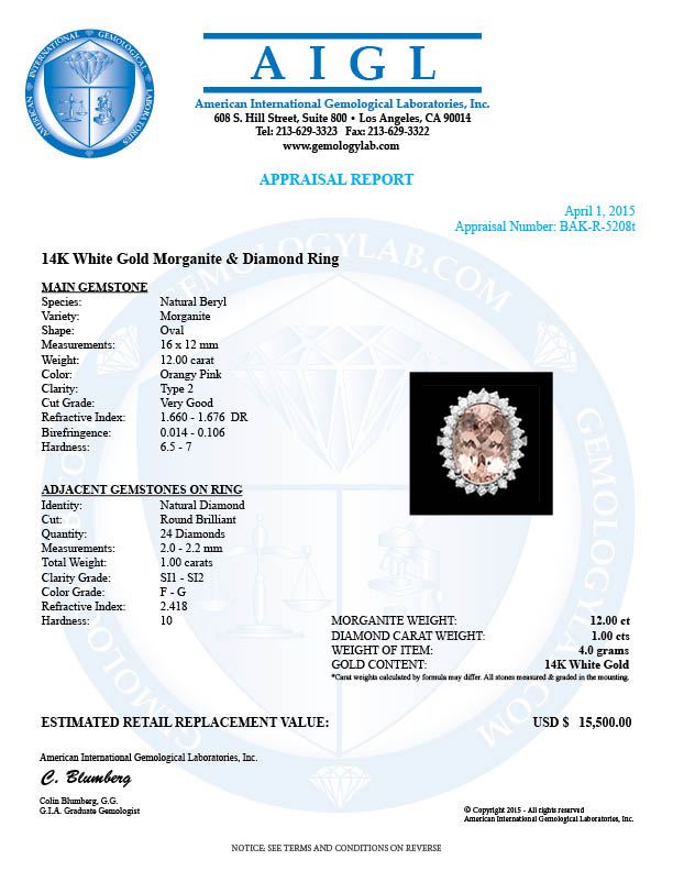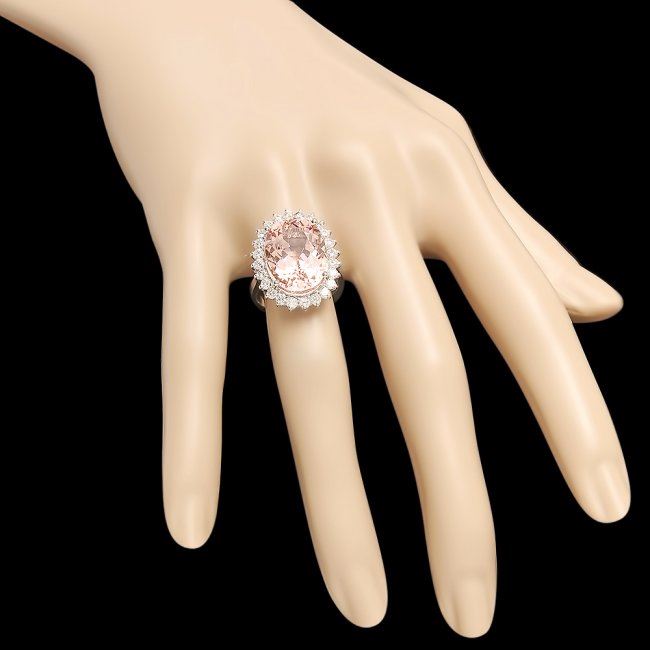 Retail: $15,400.00 ****** 14k Gold 12.00ct Morganite 1.00ct Diamond Ring ****** Metal: 14k Solid White Gold / Size: 6.75 / Total Item Weight: 8.0 grams / Country Made: United States / / Main Stone: Morganite / Color: Pink / Carat Total Weight: 12.00 / Treatment: None / Clarity: Type 2 / Cut: Very Good / / Secondary Stone: Diamond / Carat Total Weight: 1.00 / Treatment: None / Color Grade: F - G / Clarity: SI1 - SI2 / Cut: Very Good /