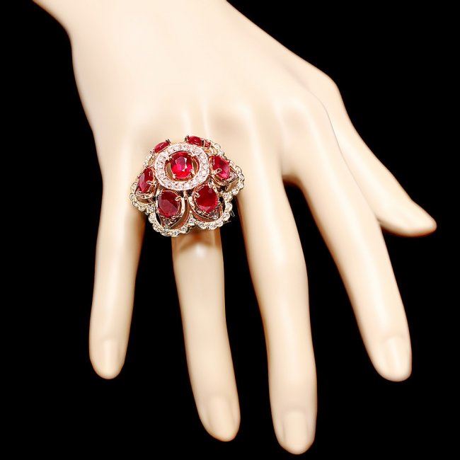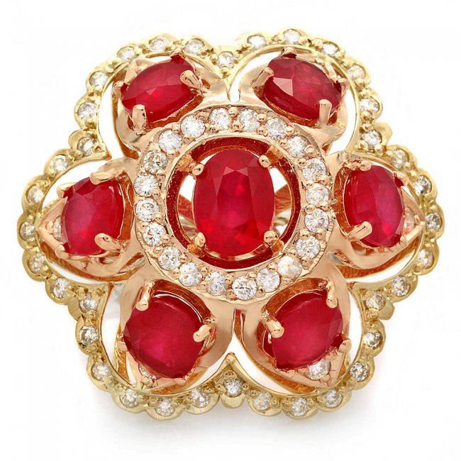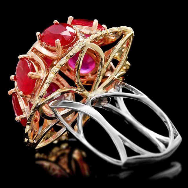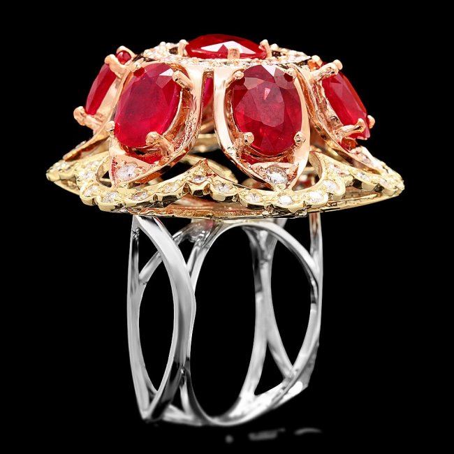 Retail: $12,900.00 ****** 14k Gold 12.00ct Ruby 1.35ct Diamond Ring ****** Metal: 14k Solid Multi-Tone Gold / Size: 7 / Total Item Weight: 16.0 grams / Country Made: United States / / Main Stone: Ruby / Color: Red / Carat Total Weight: 12.00 / Treatment: Filling / Clarity: Type 2 / Cut: Very Good / / Secondary Stone: Diamond / Carat Total Weight: 1.35 / Treatment: None / Color Grade: H - I / Clarity: SI1 - SI2 / Cut: Very Good /