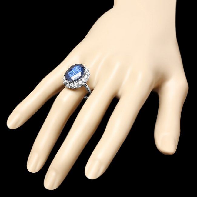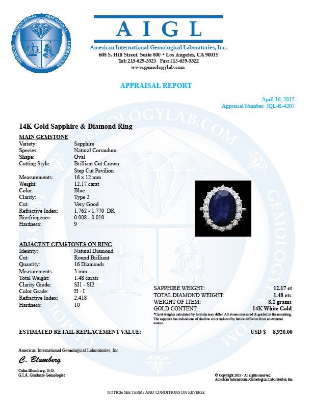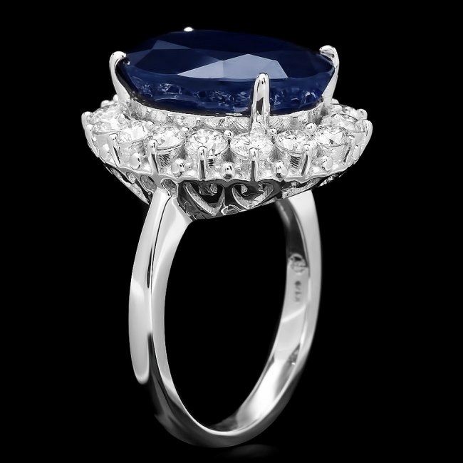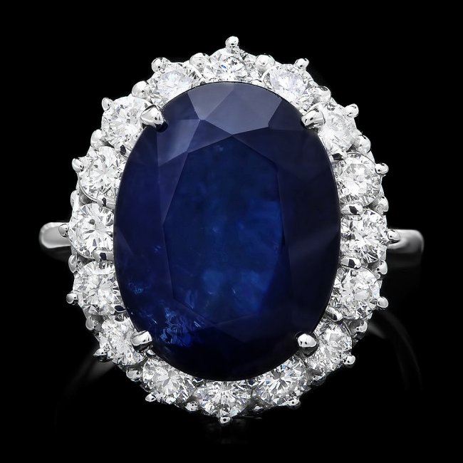 Retail: $8,800.00 ****** 14k Gold 12.17ct Sapphire 1.48ct Diamond Ring ****** Metal: 14k Solid White Gold / Size: 7.5 / Total Item Weight: 8.2 grams / Country Made: United States / / Main Stone: Sapphire / Color: Blue / Carat Total Weight: 12.17 / Treatment: Diffusion / Clarity: Type 2 / Cut: Very Good / / Secondary Stone: Diamond / Carat Total Weight: 1.48 / Treatment: None / Color Grade: H - I / Clarity: SI1 - SI2 / Cut: Very Good /