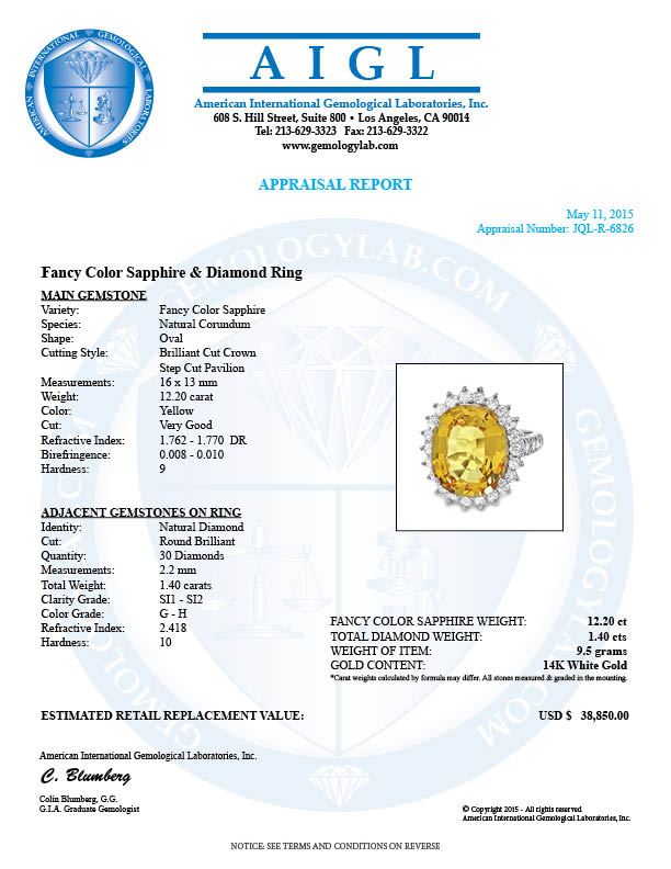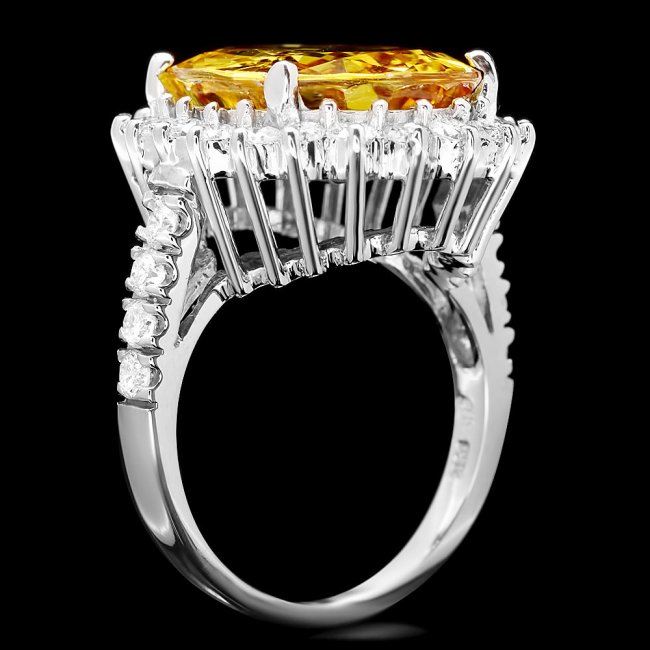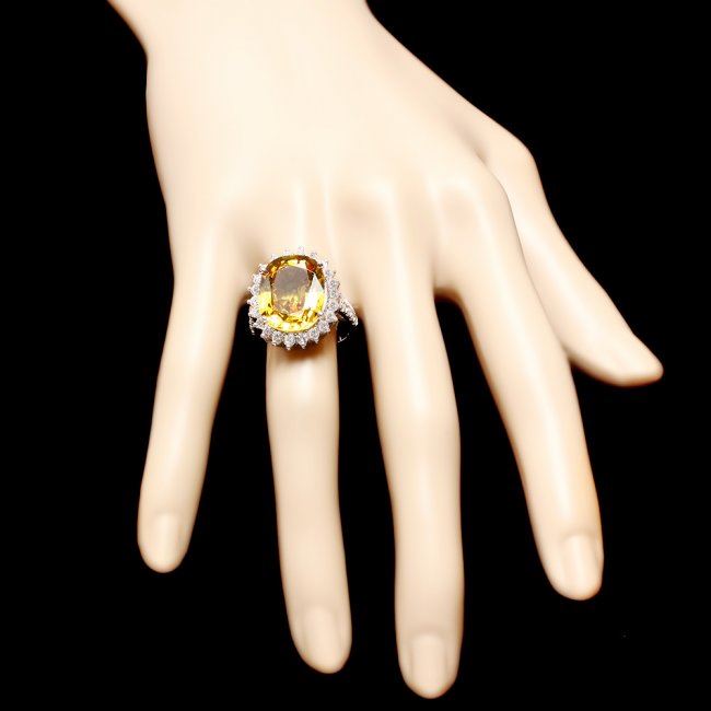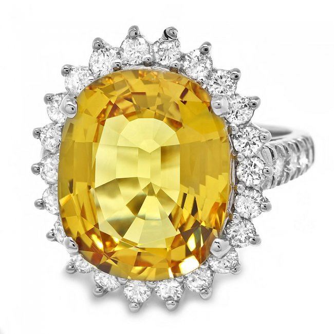 Retail: $38,900.00 ****** 14k Gold 12.20ct Sapphire 1.40ct Diamond Ring ****** Metal: 14k Solid White Gold / Total Item Weight: 9.5 grams / Country Made: USA / / Main Stone: Sapphire / Color: Yellow / Carat Total Weight: 12.20 / Treatment: Heating / Clarity: Type 2 / Cut: Very Good / / Secondary Stone: Diamond / Carat Total Weight: 1.40 / Treatment: None / Color Grade: G - H / Clarity: SI1 - SI2 / Cut: Very Good /
